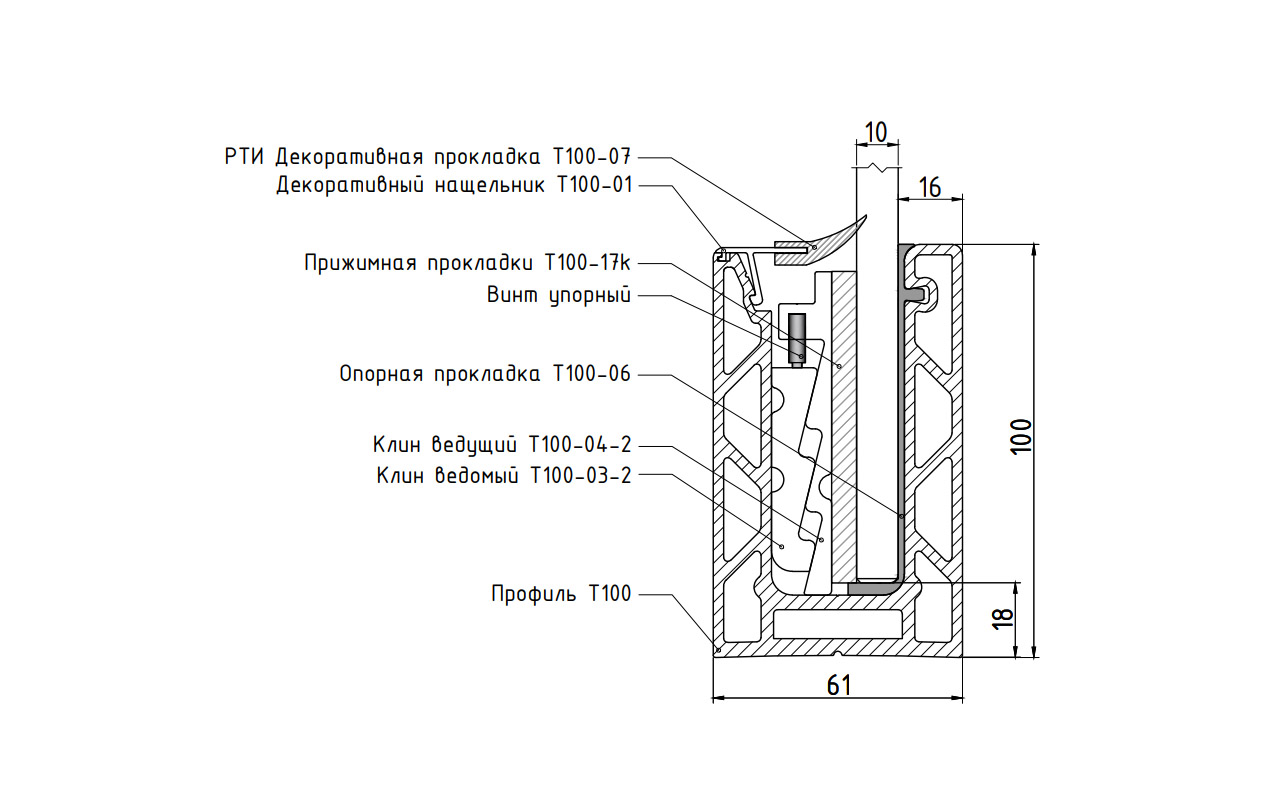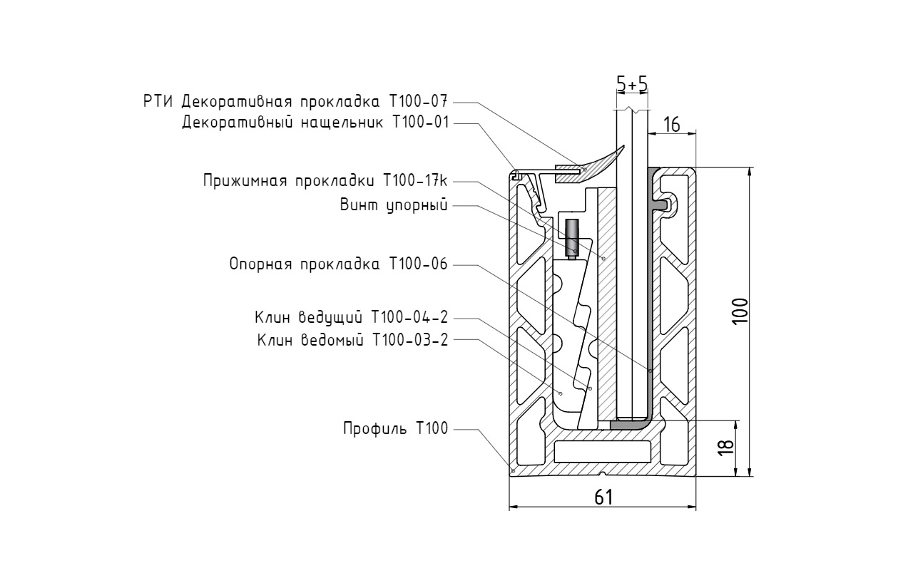 Конструкция данных зажимных систем существенно отличается от существующих на рынке. Основным техническим решением в данных системах — стало увеличение высоты прижимного клина. В аналогичных профилях, что уже существуют на рынке, высота прижимного клина 50-55мм, тогда как в профиле т100 — 80 мм. Также одной из главных особенностей профиля т100 является возможность применения стекол 20мм и триплекса 10+10мм, чем не могут похвастаться прочие аналоги алюминиевых профилей. Крепежные отверстия гарантирует более удобную и быструю установку профиля на объекте, это уменьшает время и затраты на монтаж.