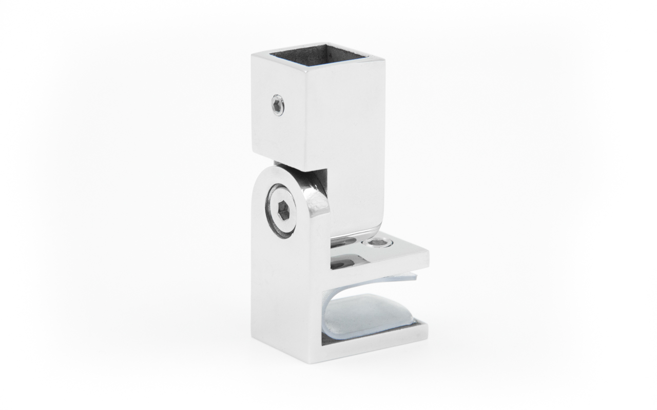 Коннектор предназначен для крепления трубы 15х15 мм к стеклу под произвольным углом при монтаже штанг верхней обвязки душевых кабин.