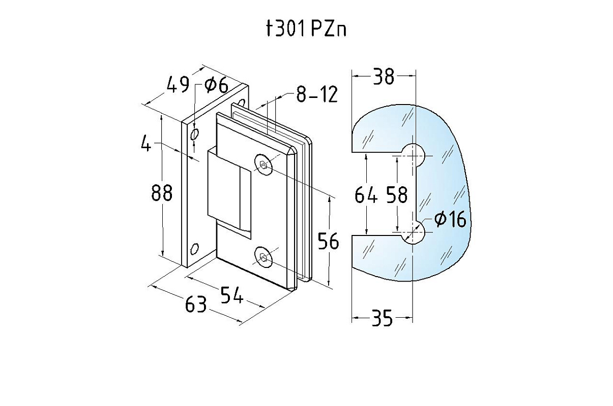 Петля для душевой кабины стена-стекло 90° 90х55 мм цинк, полированная t301 PZn