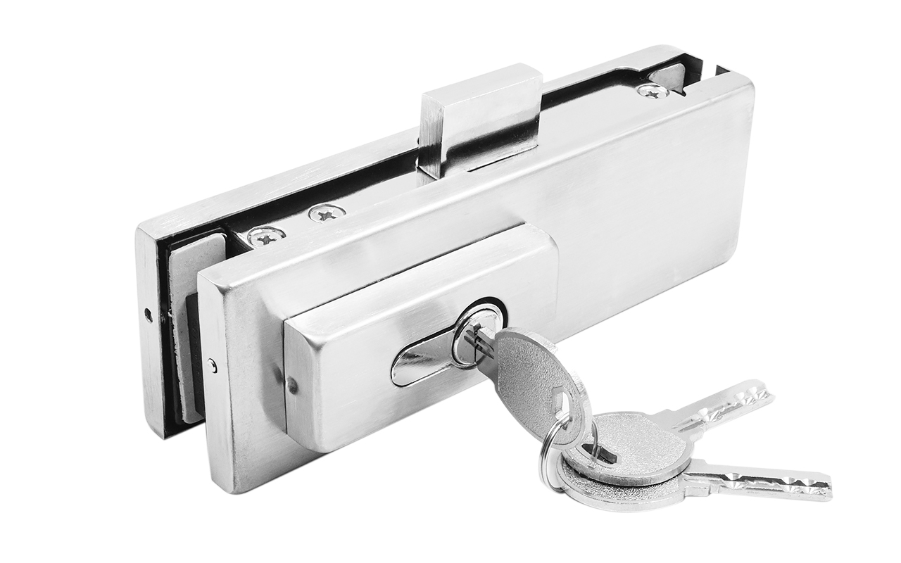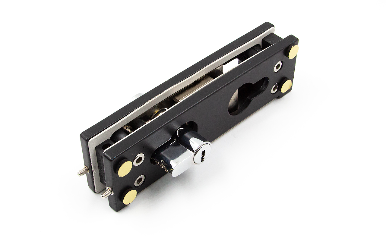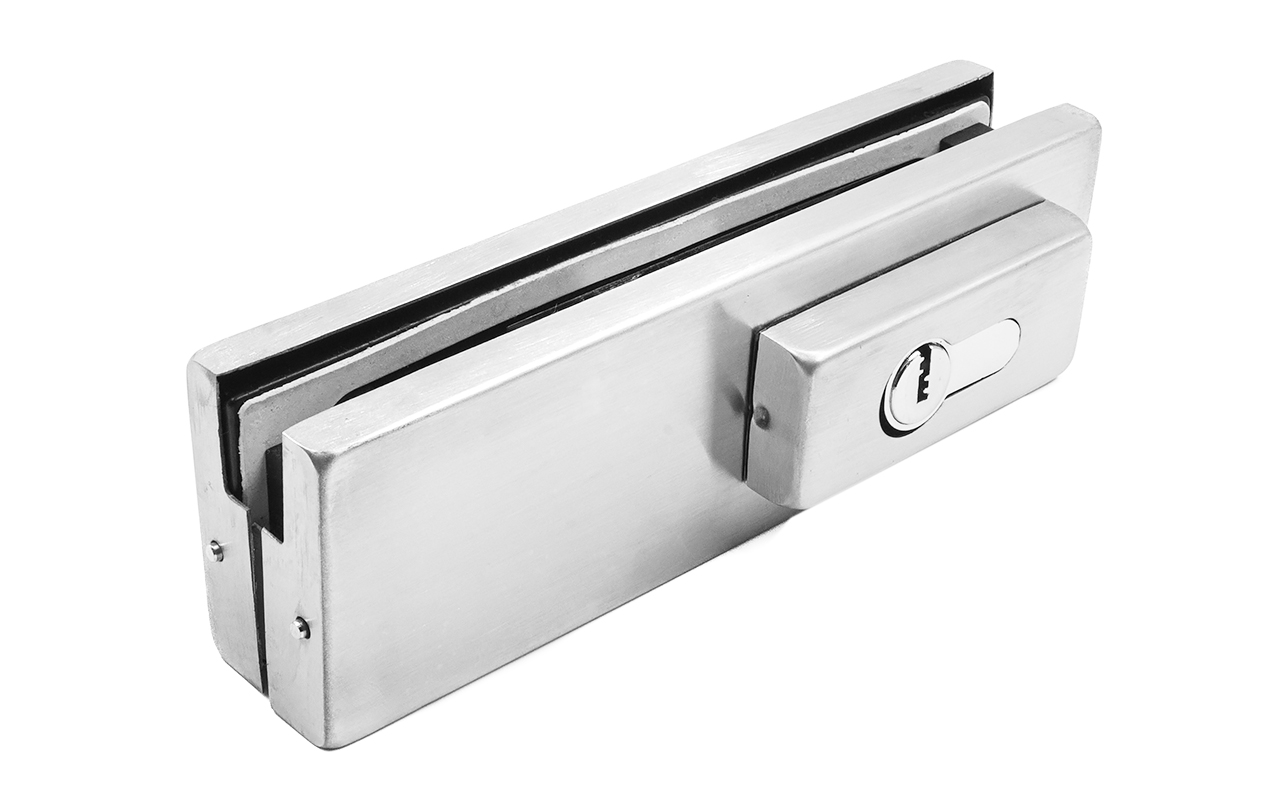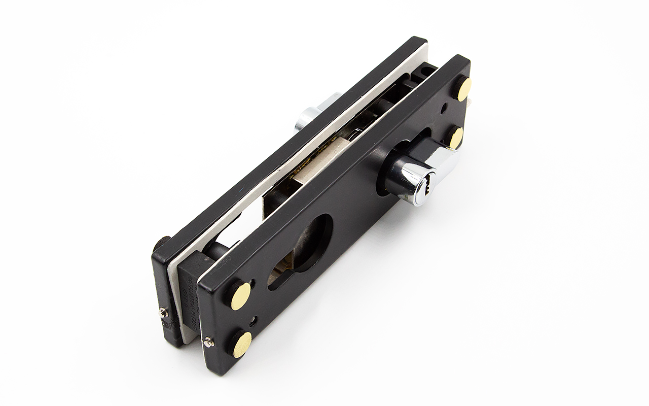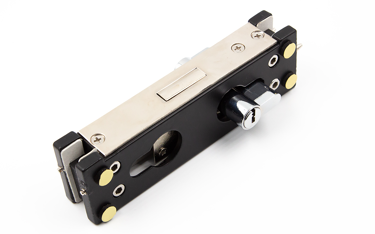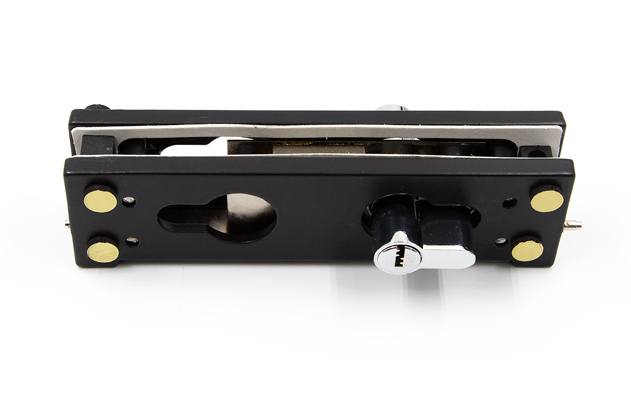 Замок для стеклянной двери центральный с прямоугольным ригелем, шлифованный, вырез 13