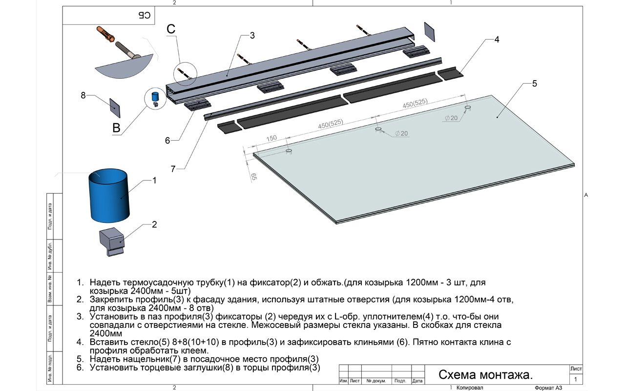 Козырек на алюминиевом профиле ,вынос до 950мм k671-100-2.4