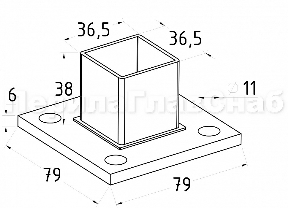 Деталь для крепления стойки из трубы 36.5х36.5 (k808, k866, Rk808). Основание закрывается декоративной крышкой (k076, k064-3, k030, k396). Предназначена прежде всего для крепления основания стоек самосборных ограждений внутри трубы с помощью специального клея (Ф-1105, Ф-1106, Ф-1127)