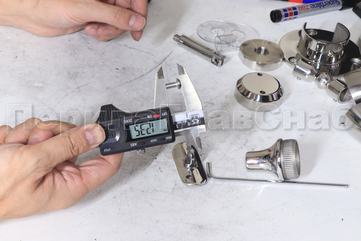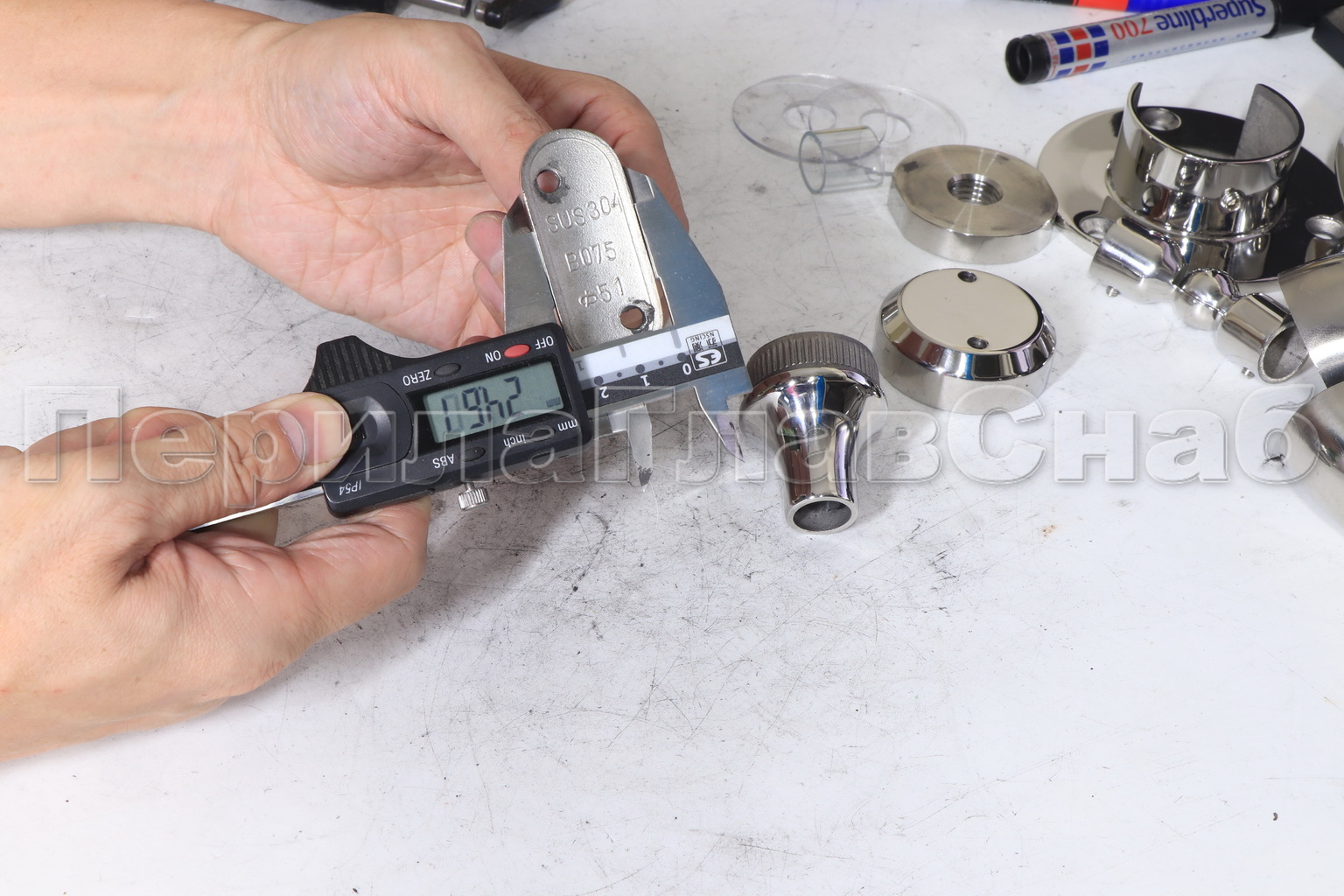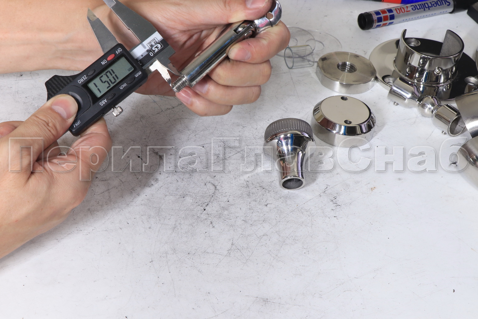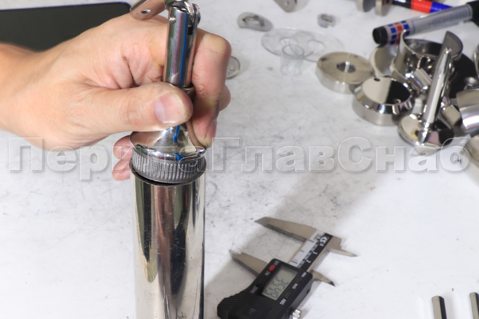 Наконечник регулируемый по высоте на стойку Ø38.1х1.5 мм, с регулируемым ложементом под поручень Ø50.8 мм, литой, полированный, нержавеющий (AISI 304) k317-3