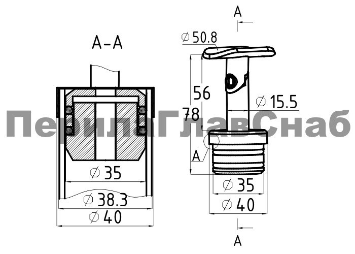 Наконечник на стойку, под золото, Ø38.1 мм, палец регулируемый, с механическим креплением и юбкой, закрывающей срез трубы, с регулируемым ложементом под поручень Ø50.8 мм