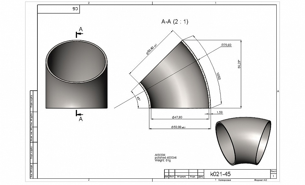 Половинка отвода поручня под сварку для Ø50.8х125/2х1.5, 45°, полированный 400 Grit (AISI 304) k021-45