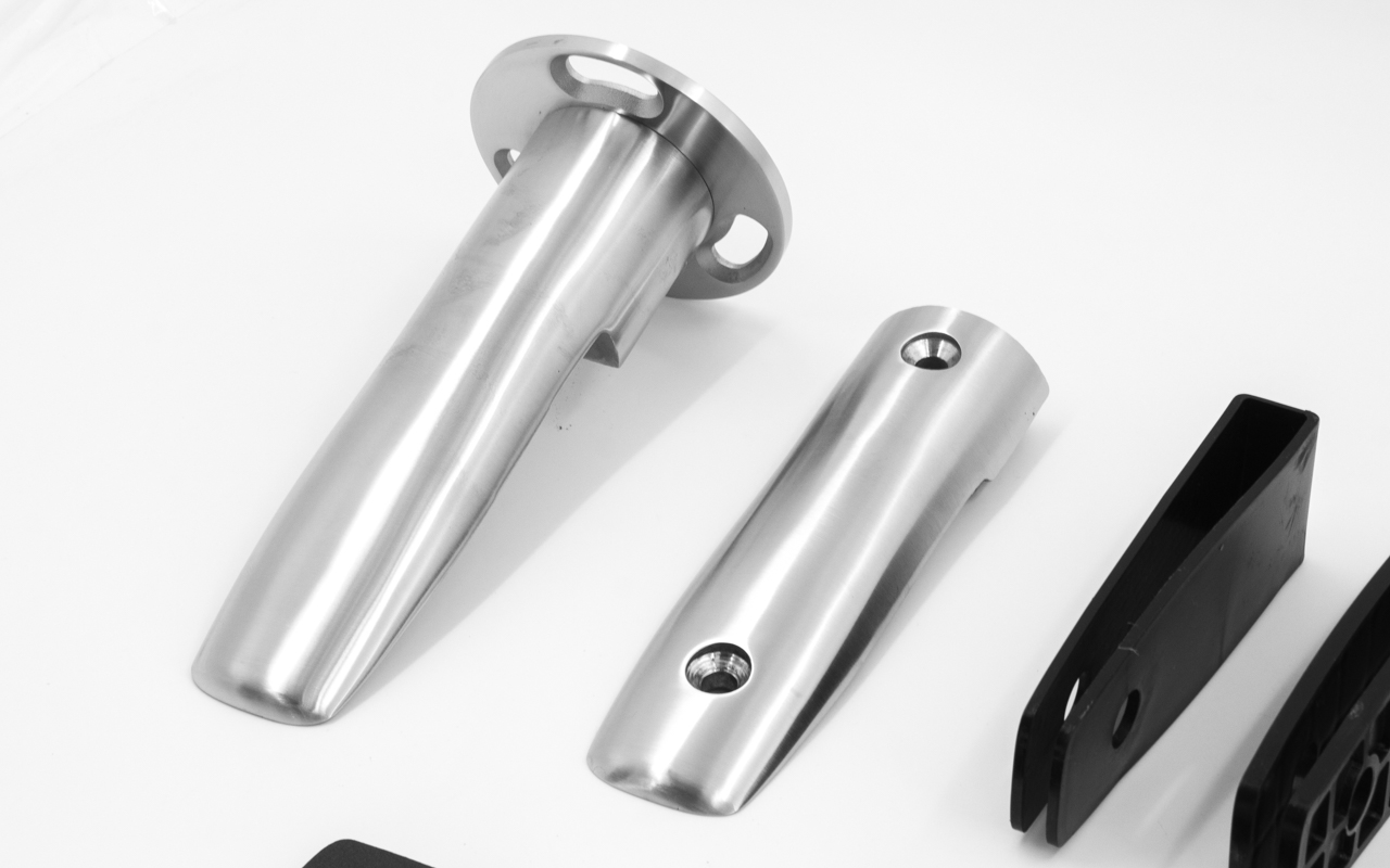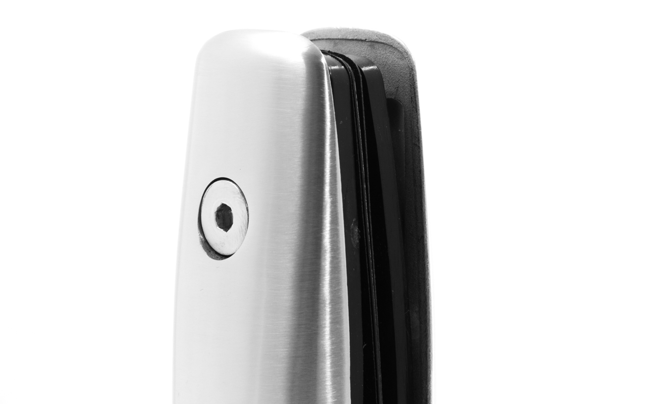 модель имеет необычный дизайн, что выделяет её из общей массы напольных стеклодержателей. Выгодное расположение ребер жесткости внутри стеклодержателя, увеличивает его жесткость, что позволяет ставить ограждения высотой до 1200мм, не боясь боковых нагрузок.