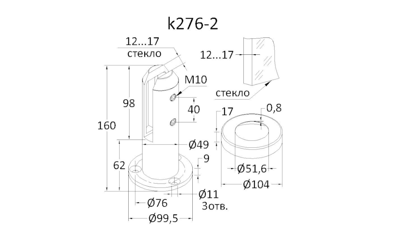 Стеклодержатель Ø50х10х18, шпилька М16х205 мм, для стекла 8-40 мм, AISI (201), с возможностью регулировки выноса до 65 мм, для торцевого крепления стекла, полированный, литой k277-3