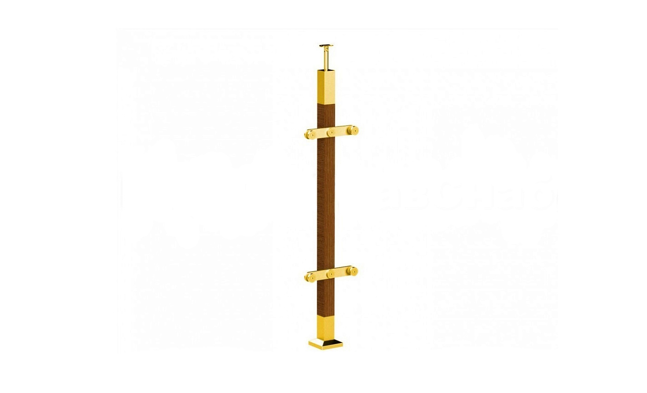 Готовая стойка 40х40х950 мм, деревянная, со вставками из нержавеющей стали 2х100 мм, с 2 пластинчатыми стеклодержателями, под золото
