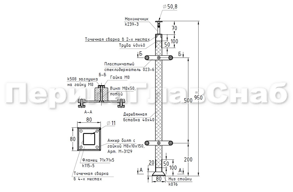 Готовая стойка 40х40х950 мм, деревянная, со вставками из нержавеющей стали 2х100 мм с 2 пластинчатыми стеклодержателями, под золото k740-2-G