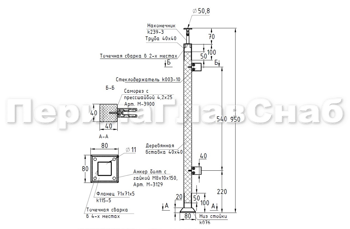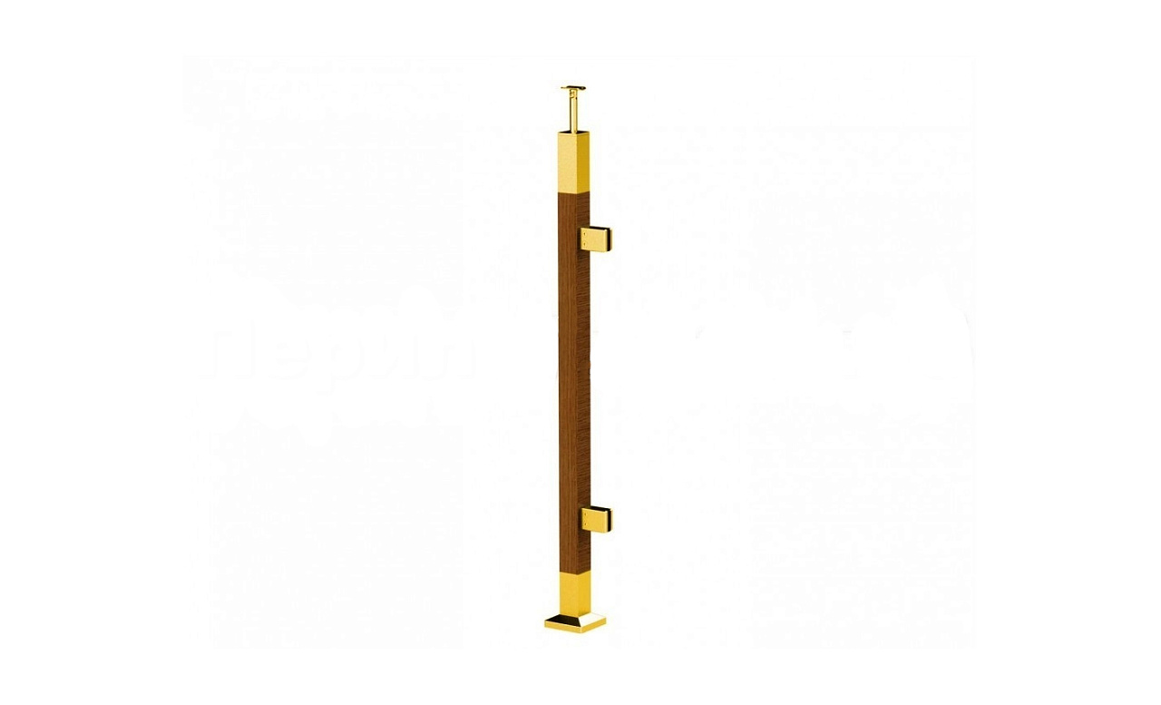 Готовая стойка 40х40х950 мм, деревянная, со вставками из нержавеющей стали 2х100 мм с 2 зажимными стеклодержателями, под золото k740-4-R-G