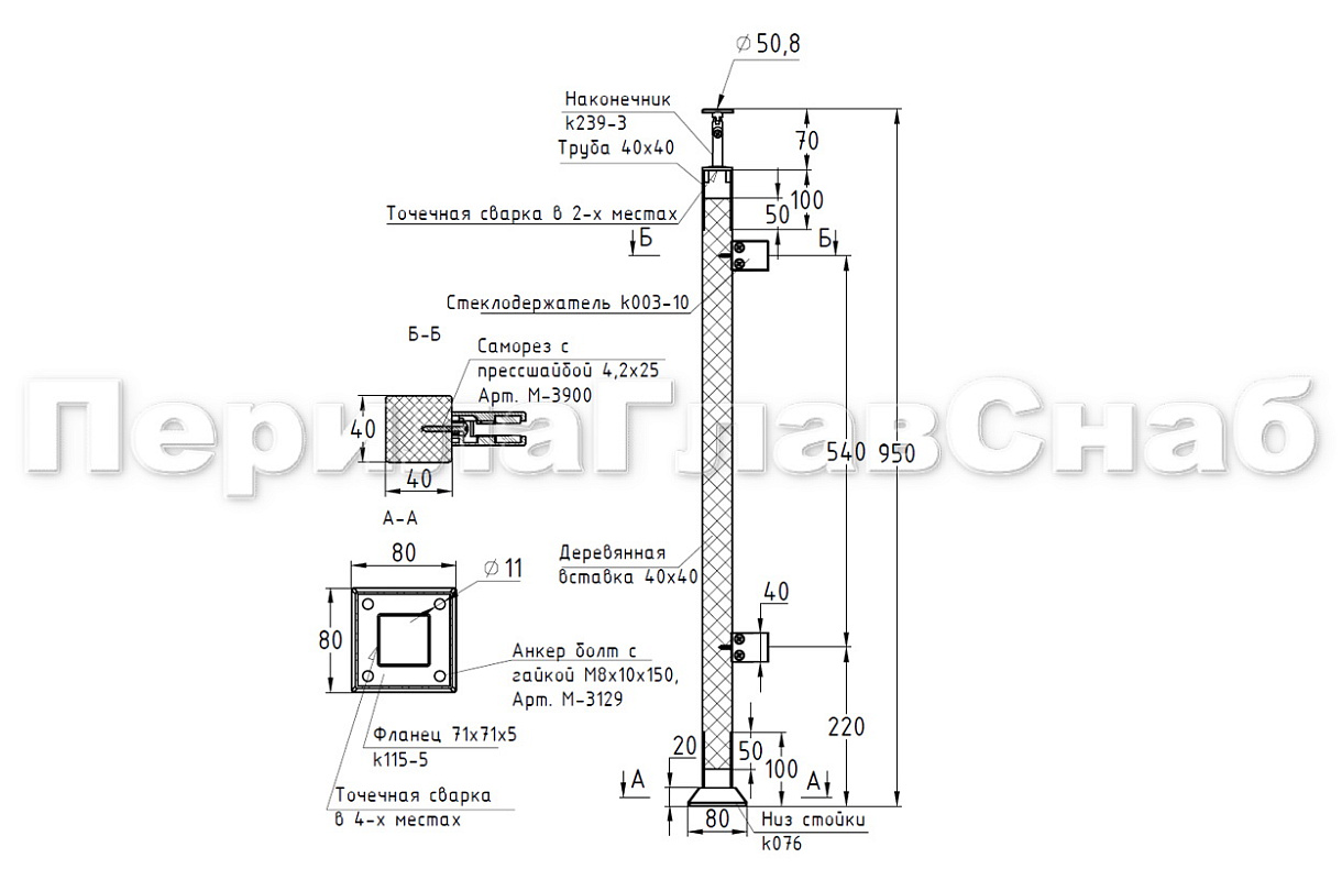 Готовая стойка 40х40х950 мм, деревянная, со вставками из нержавеющей стали 2х100 мм с 2 зажимными стеклодержателями k740-4-R