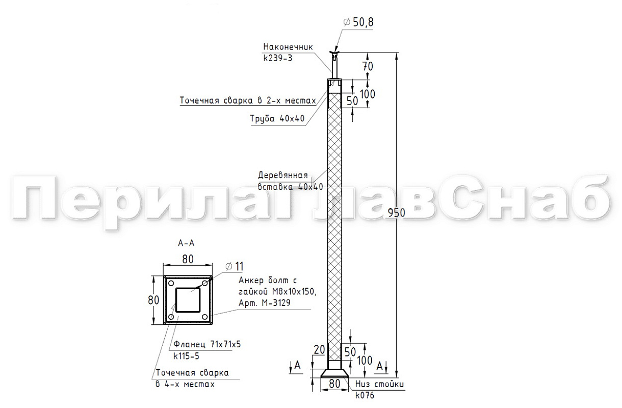 Готовая стойка 40х40х950 мм, деревянная, со вставками из нержавеющей стали 2х100мм под золото, базовая