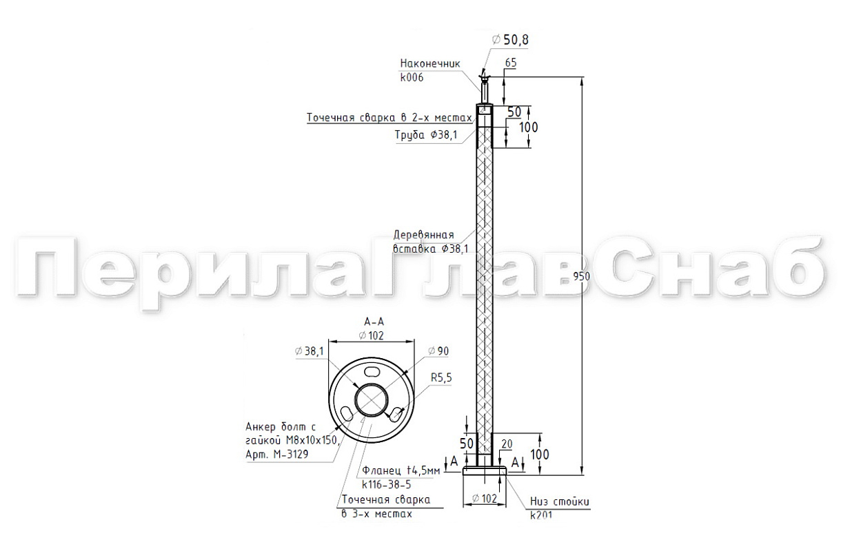 Готовая стойка Ø38,1х950 мм деревянная, со вставками из нержавеющей стали 2х100 мм базовая k741