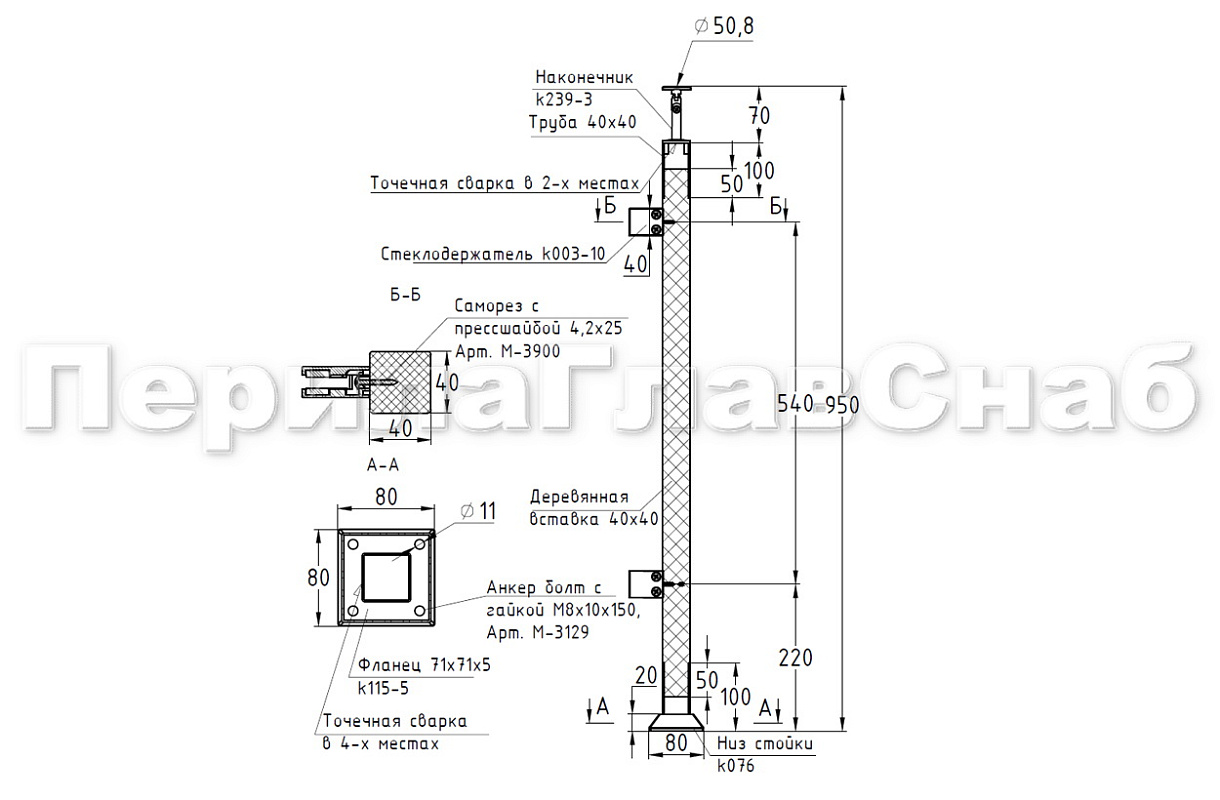Готовая стойка 40х40х950 мм, деревянная, со вставками из нержавеющей стали 2х100 мм с 2 зажимными стеклодержателями k740-4-L