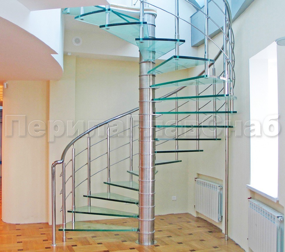 Винтовые. Отличный вариант для ограниченных пространств. Такая лестница из стекла смотрится оригинально и привлекательно в любом помещении. Эти конструкции широко используются при строительстве небольших дач, частных домиков и пентхаусов.