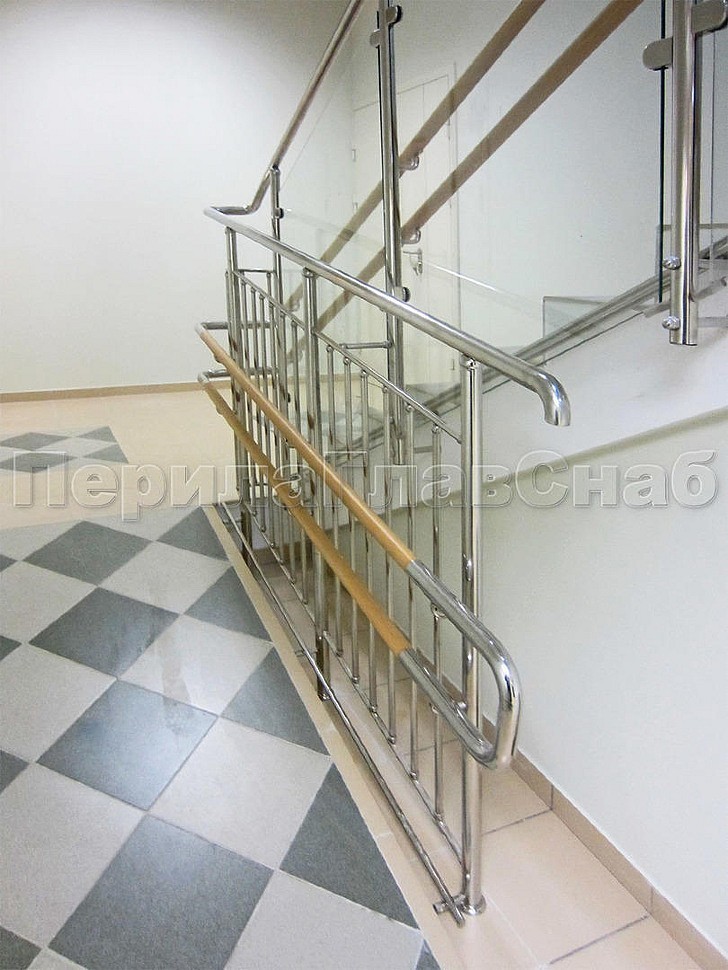 Нержавеющее ограждение со стеклом и стойками. Металлический поручень крепится к стойкам через полусферические наконечники. Детские поручни - на выносных держателях.
