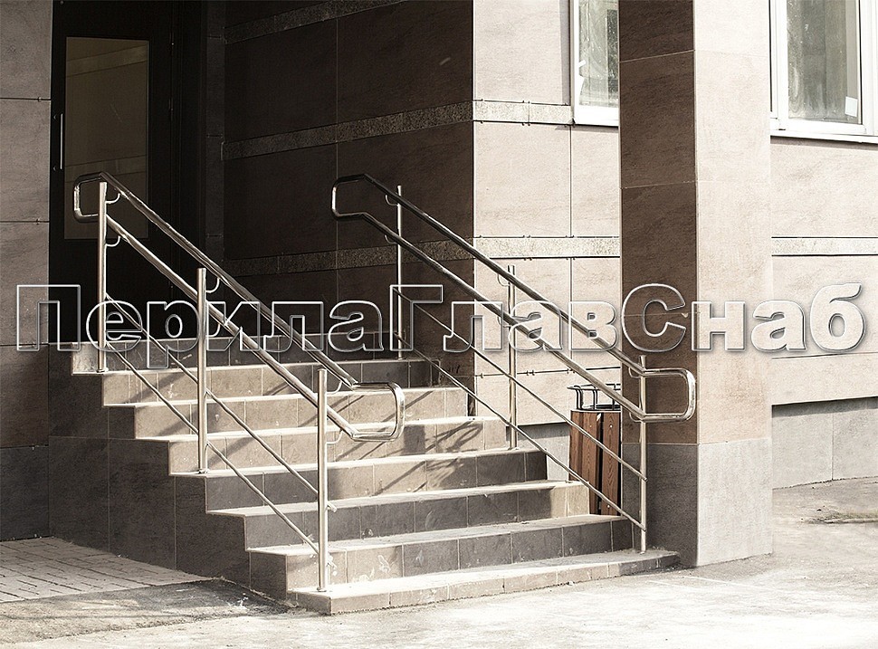 Трехригельное ограждение, стойки крепятся в пол. Поручень для инвалидов на выносном держателе.