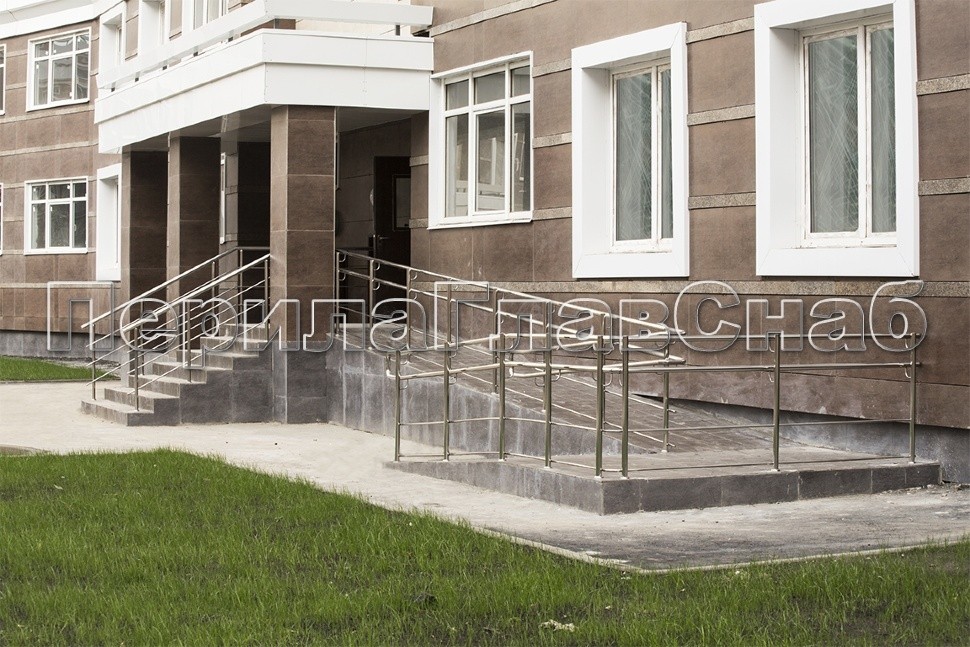Ограждение входной группы выполнено из нержавеющей стали с трехригельным заполнением. Пандус для инвалидов с ограждением из нержавеющей стали.
