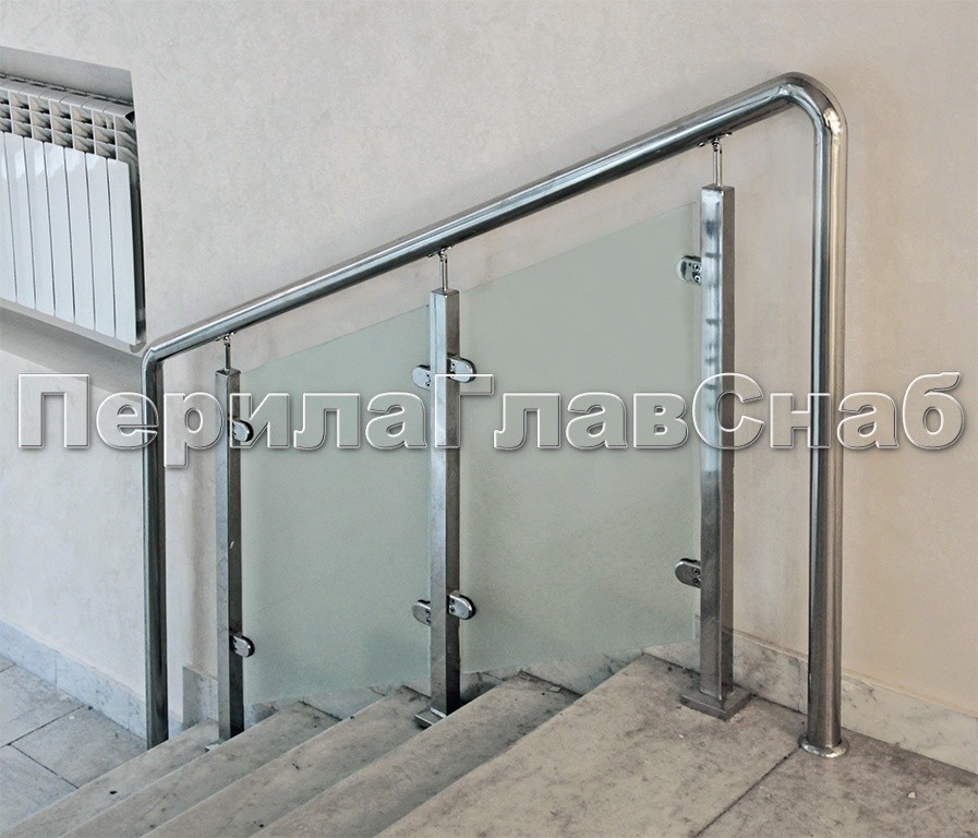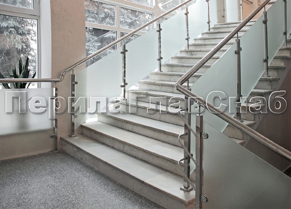 Ограждения лестницы на квадратных стойках 40х40 мм, крышка стойки k076. Стекло оклеено матовой пленкой. Стекло сложной формы на переходе на площадку.
