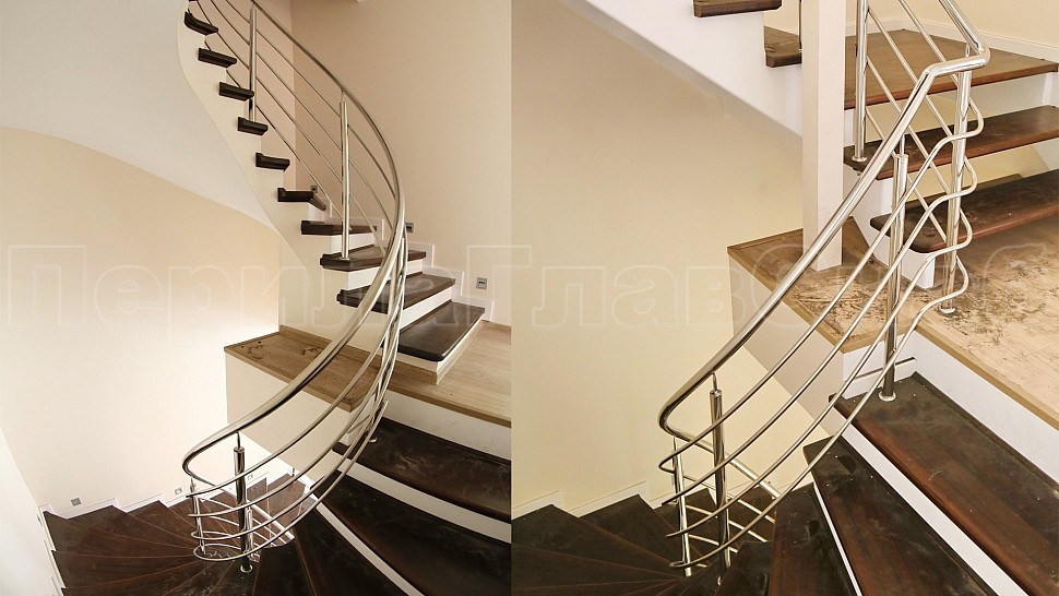Поручень диаметром 38,1 мм из прямых и радиусных участков прокатанных по месту на станке ( при прокатке поручень приобретает в сечении овальную форму). Крепление нержавеющих элементов ограждения между собой выполнено при помощи точечной аргонно-дуговой сварки, длина швов после нее — 2 мм, на финальном этапе монтажа швы были зачищены и отполированы.