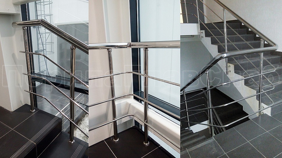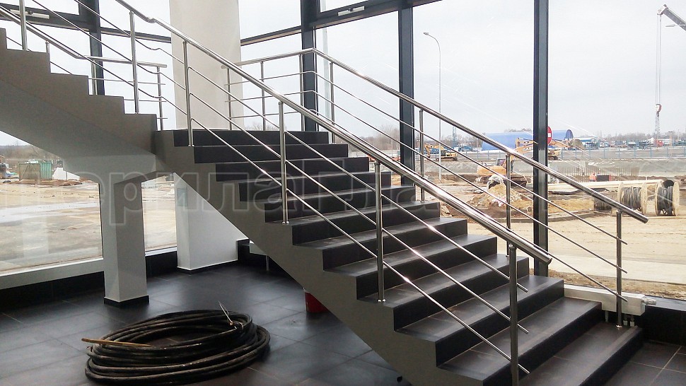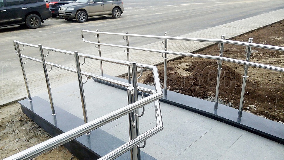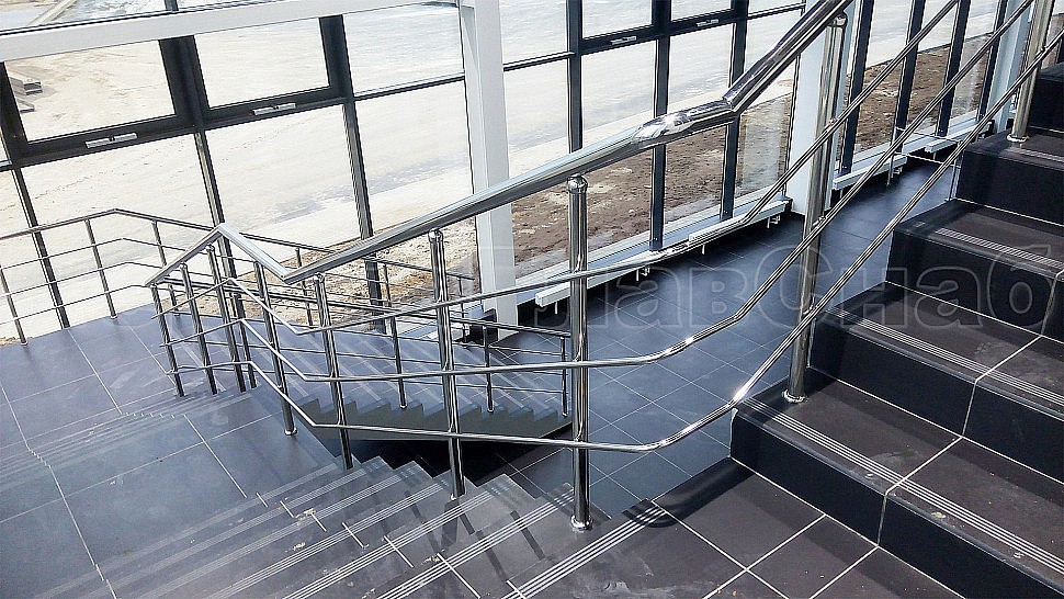 Административно-бытовому зданию были установлены ограждения с тремя ригелями для внутренней лестницы и входной группы из полированной нержавеющей стали. Высотой 950 мм и стойками диаметром 38 мм, с креплением сверху методом алмазного бурения диаметром 42 мм на глубину 70 мм, устанавливаются через две ступени в третью, низ стойки декоративная крышка диаметр 56 мм; поручень завязан, окончание поручня заглушка. Крепление нержавеющих элементов ограждения между собой точечная аргонно-дуговая сварка, с последующей зачисткой и полировкой.