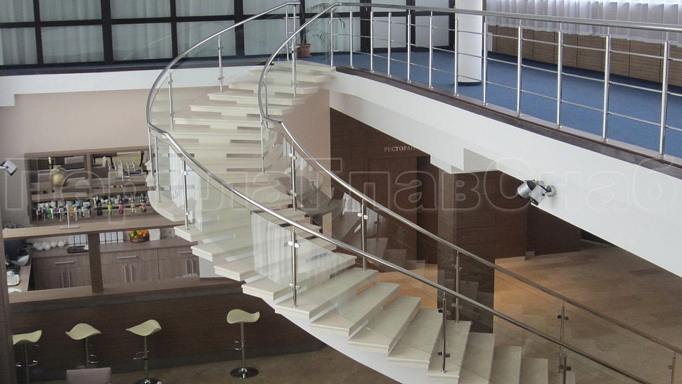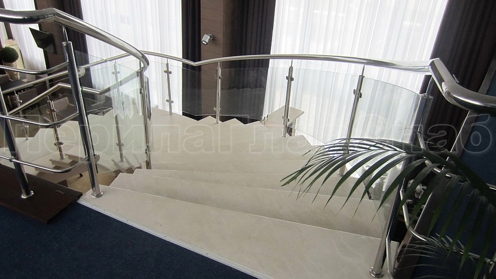 - Цельностеклянные ограждения на лестницу с зажимными стеклодержателями и стойками. Всего было установлено восемь погонных метров ограждения. Поручни и стойки выполнены из нержавеющей стали, а осветленные стекла придают конструкции визуальную легкость и современного изыска в исполнении.