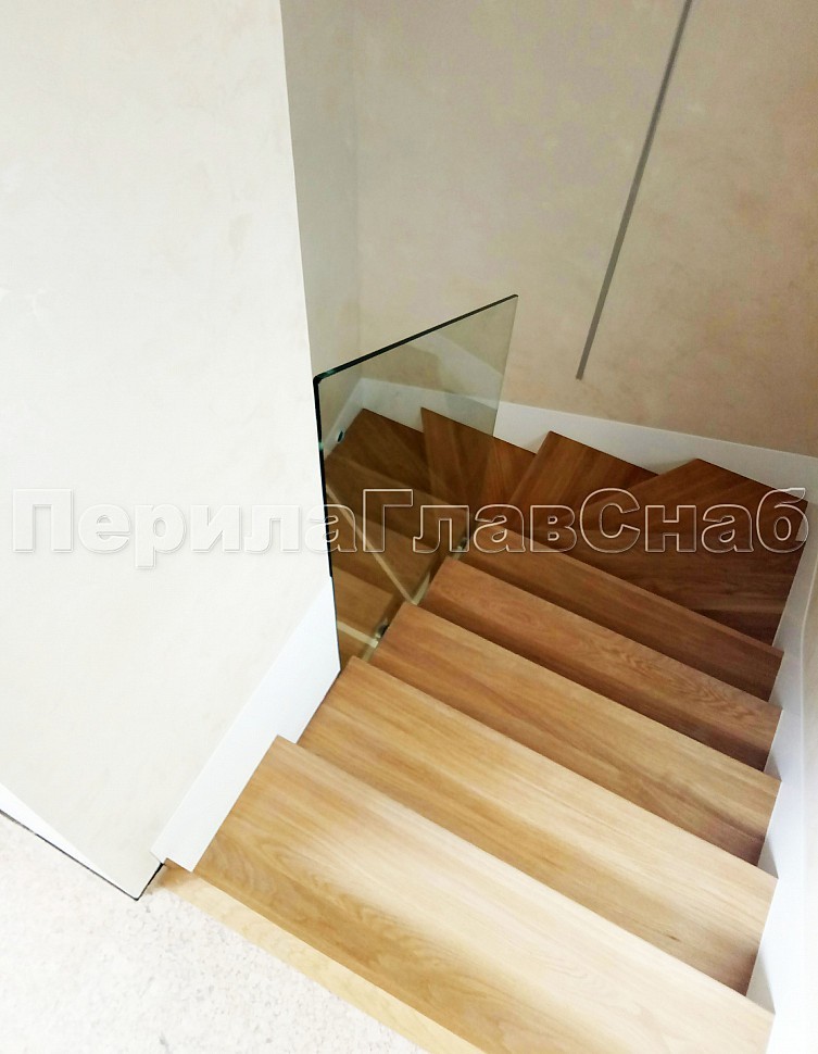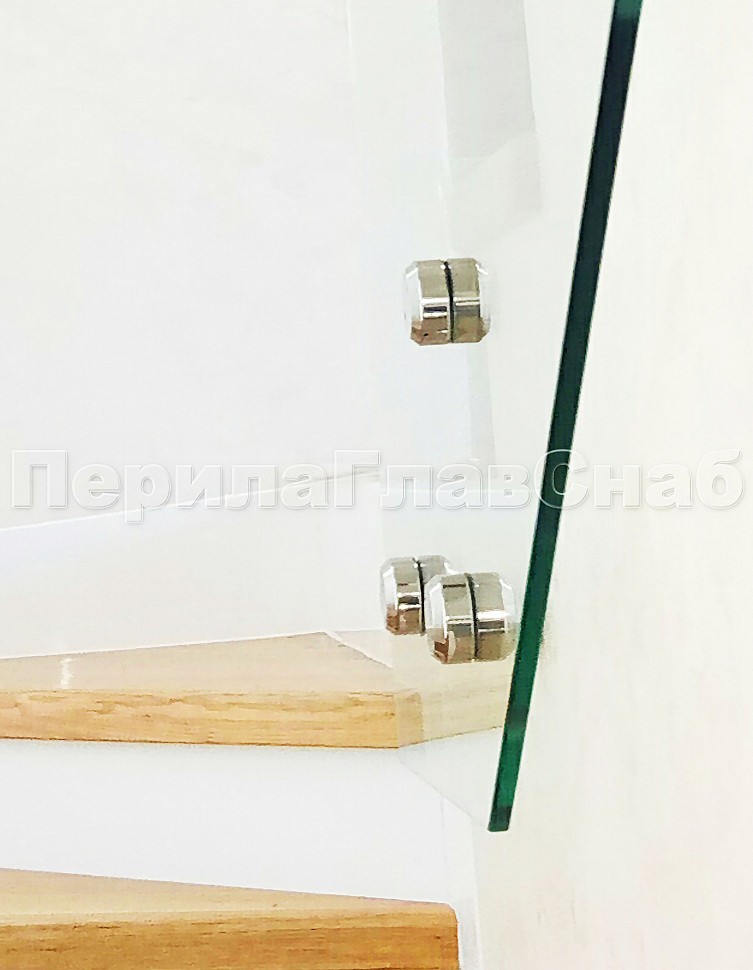 Стекло прозрачное, каленое 10 мм, крепится к торцу лестничного марша на точечном креплении из нержавеющей стали.
