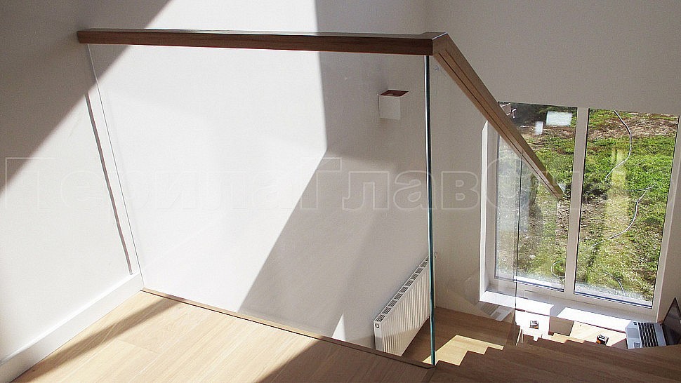 Объект- двухмаршевая лестница и площадка. Всего было установлено 7 погонных метров ограждений. Каленое стекло оптивайт закреплено на боковых стеклодержателях к лестнице, толщина стекла- 10мм. Сверху на стекло установлен лакированный поручень из массива дуба. Между маршами также была установлена стеклянная перегородка, призванная обезопасить жильцов дома помладше.