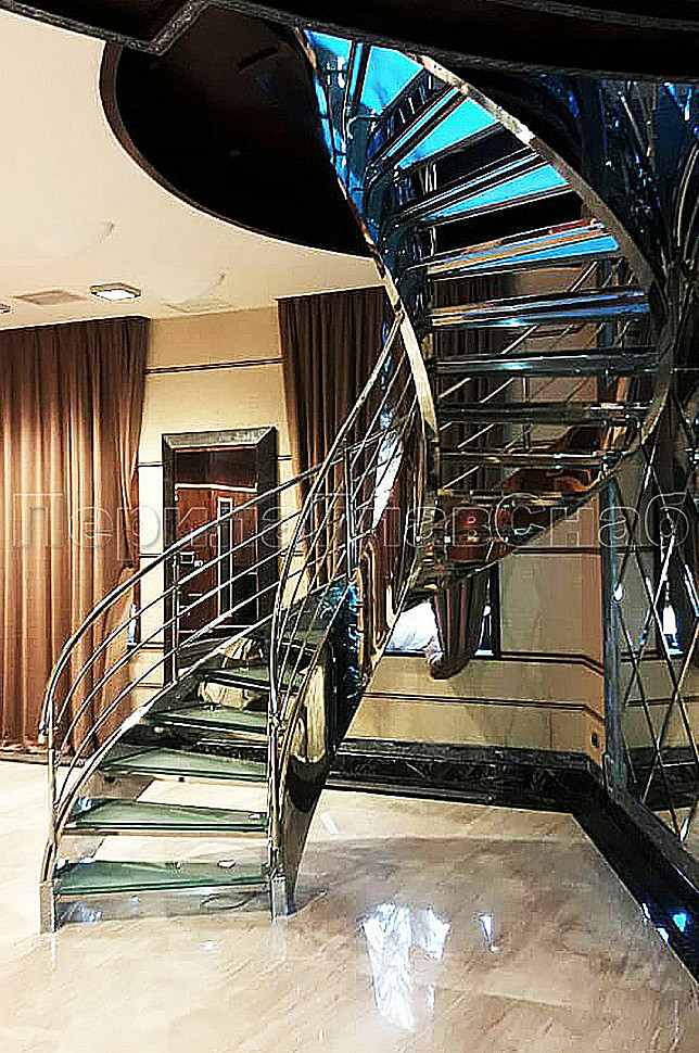 Винтовая лестница позволяет компактно расположить переход с этажа на этаж и сделать помещение более просторным. Закрученная конструкция из труб, выполненных из нержавеющей стали, дополнена стеклянными ступеньками, которые предоставляют простор для подсветки и общего оживления интерьера.Жесткость конструкции получена благодаря применения тетив из толстого металла, который прокатан по винту и обшит декоративным листом из полированной нержавеющей стали. Тетива — основной несущий элемент, к которому крепятся ступени.