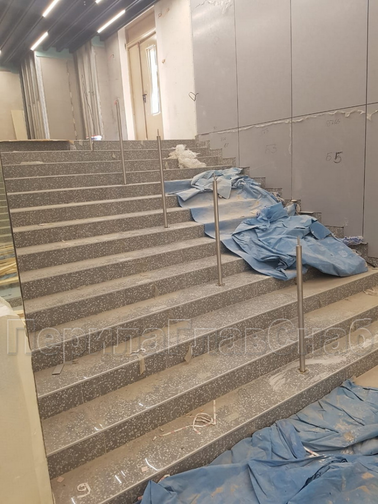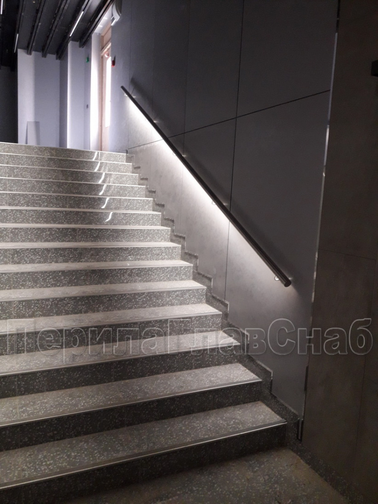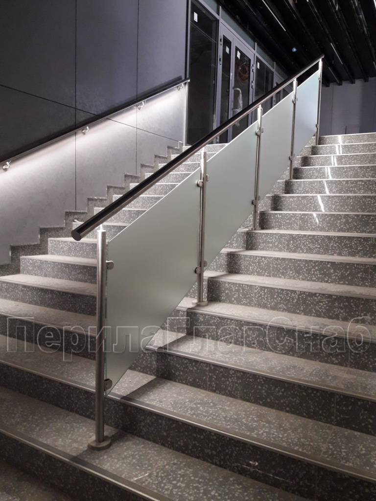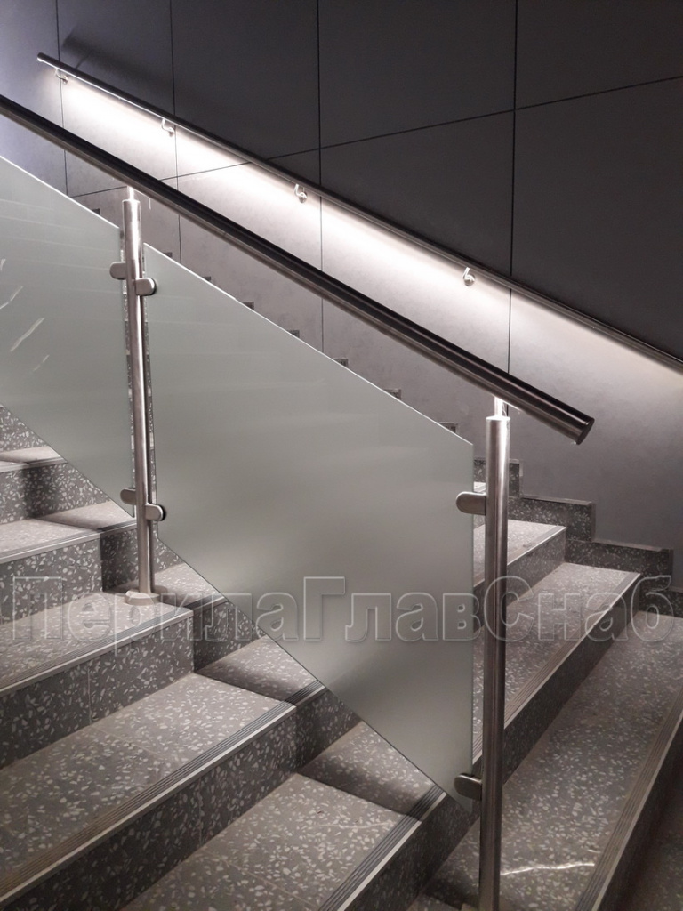 Конструктив: перила с подсветкой и стеклянным заполнением, пристенные поручни с подсветкой, сталь шлифованная.