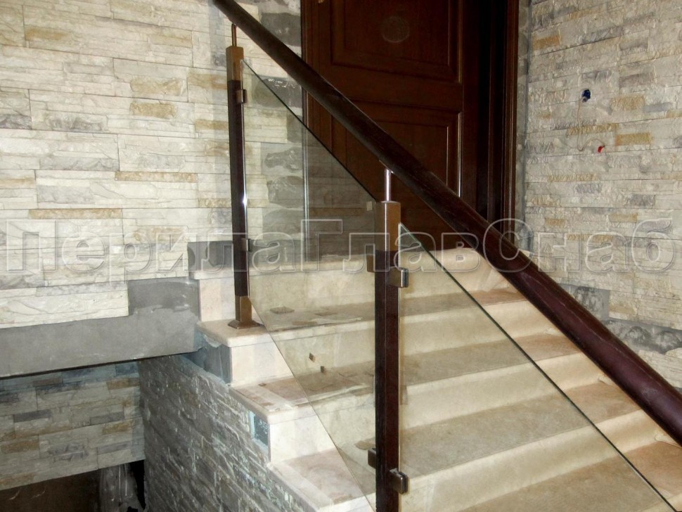 Ограждение с деревянным поручнем с зажимными стеклодержателями и стойками