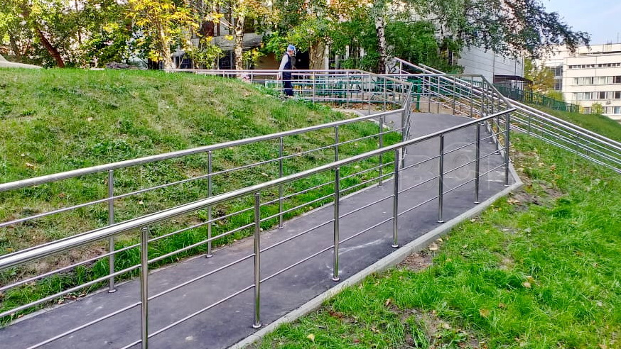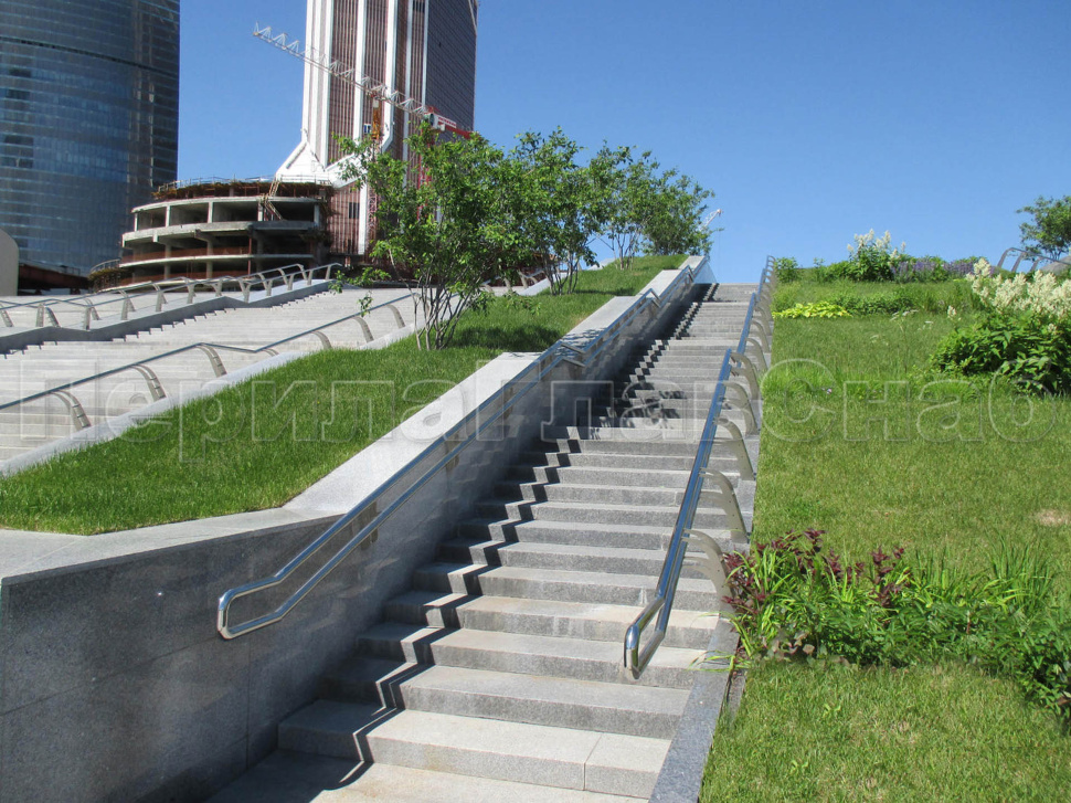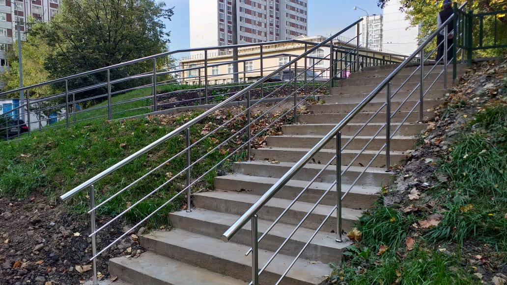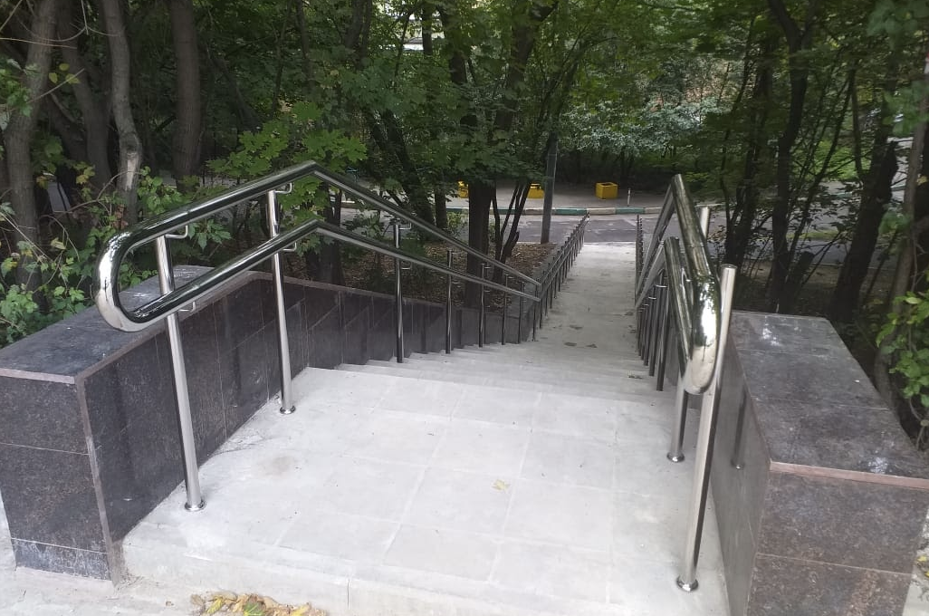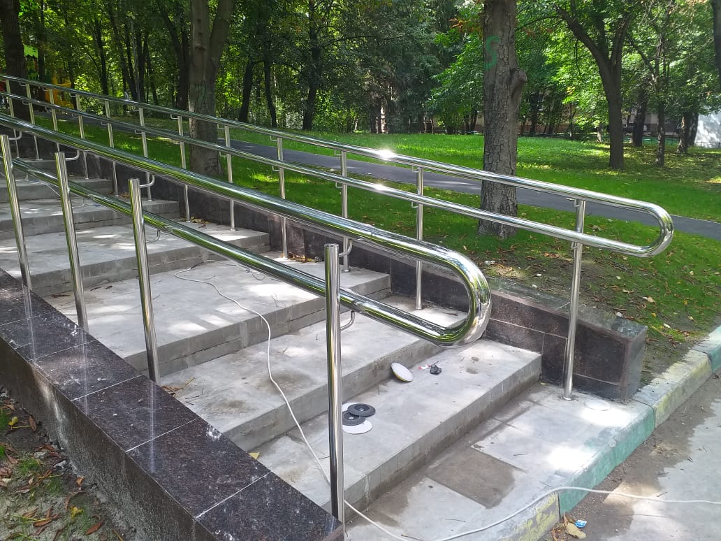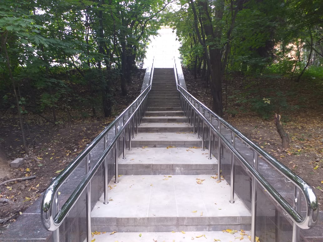 На парковых лестницах и на затяжных подъемах/спусках устанавливаются нержавеющие или стеклянные перила и потокоразделители. Обычно устанавливают перила из круглой трубы 50 мм диаметра. Если используется ригельное заполнение ограждений, то ригели крепятся "антивандальной" сваркой (два шва сверху и снизу).