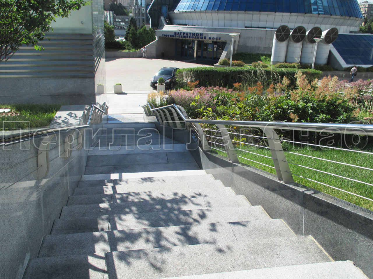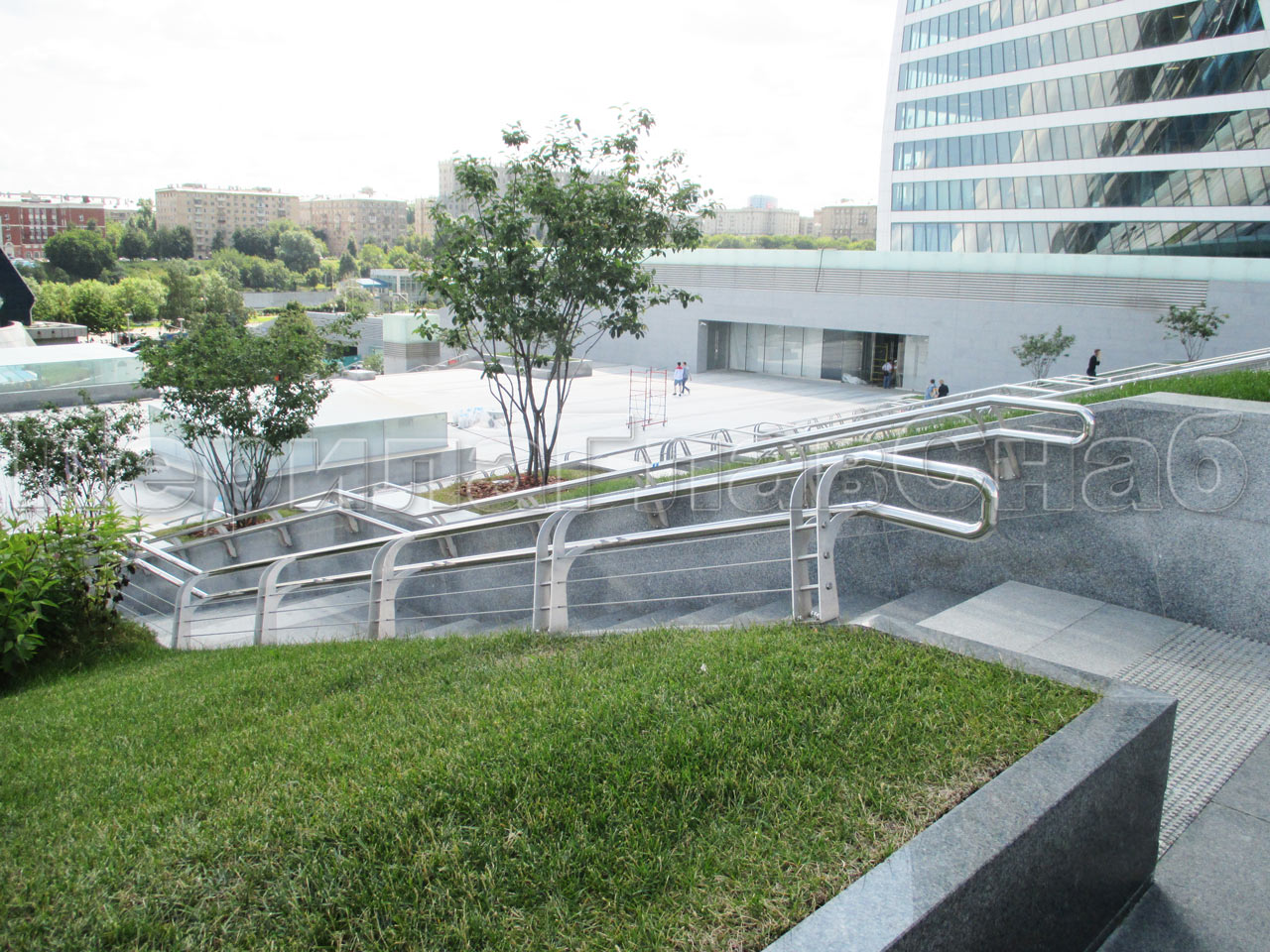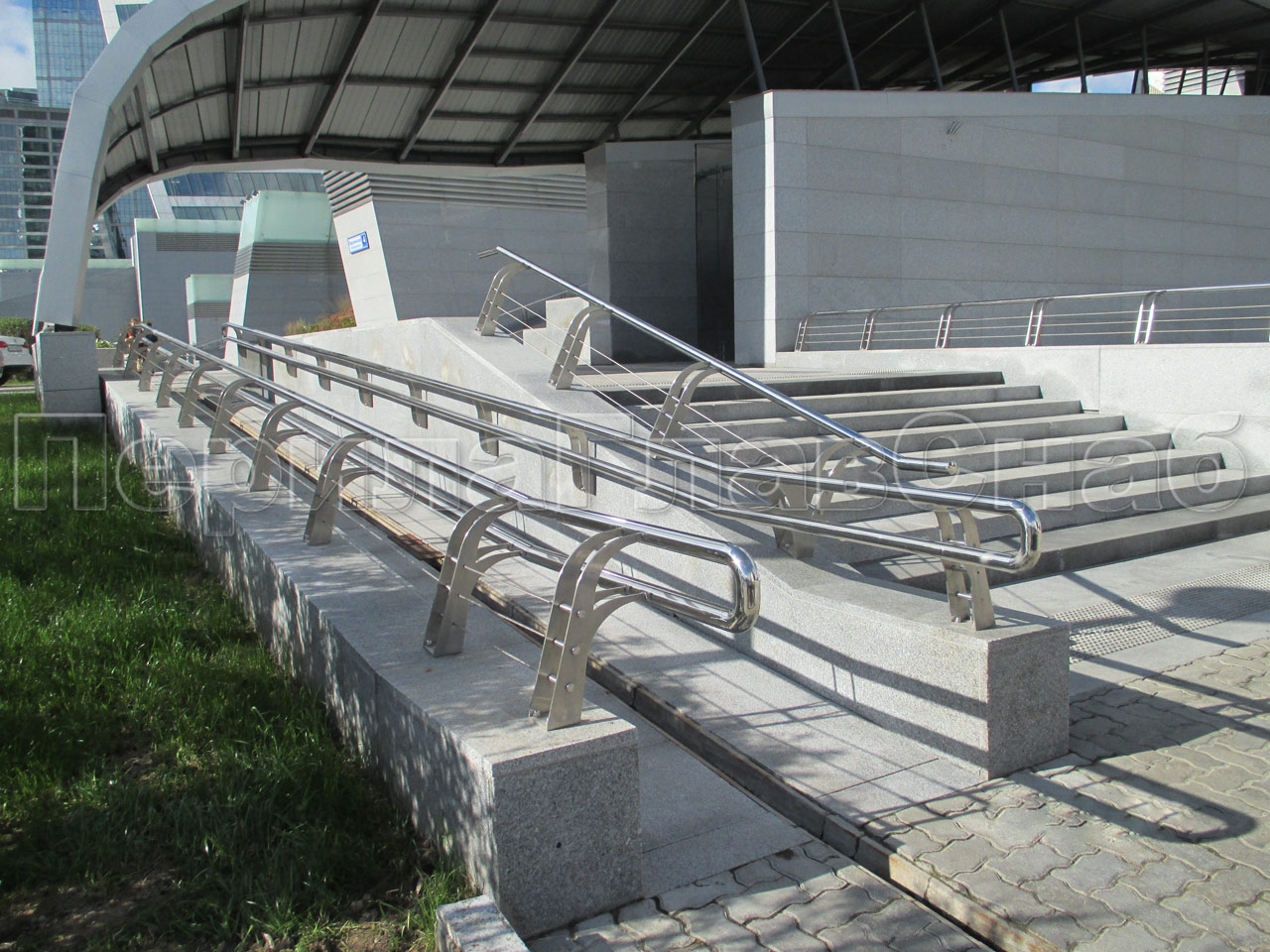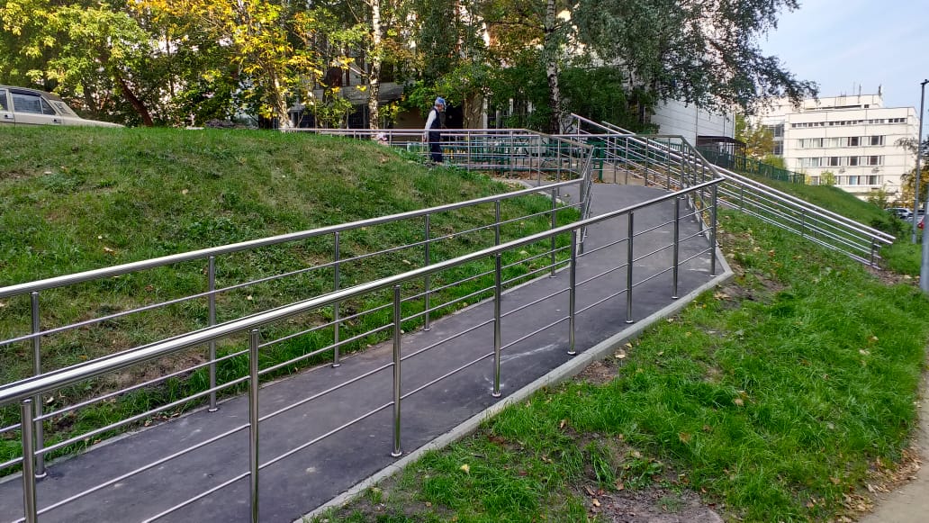 На парковых лестницах и на затяжных подъемах/спусках устанавливаются нержавеющие или стеклянные перила и потокоразделители. Обычно устанавливают перила из круглой трубы 50 мм диаметра. Если используется ригельное заполнение ограждений, то ригели крепятся "антивандальной" сваркой (два шва сверху и снизу).
