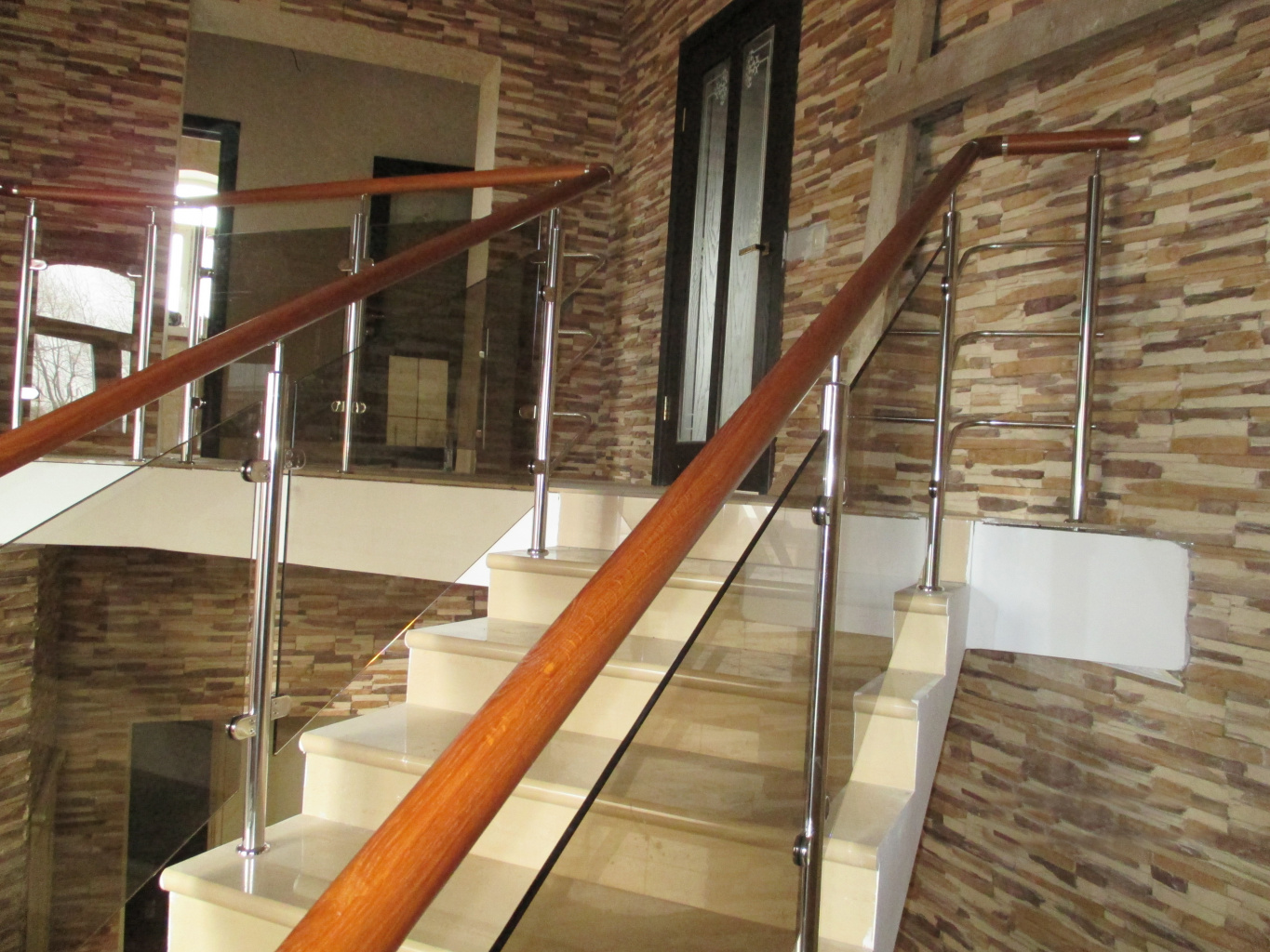 Комбинированные изделия из стали со стеклом. Такие ограждающие конструкции гармонично впишутся в любой интерьер. Они выглядят эстетично и современно и при этом обеспечивают абсолютную безопасность эксплуатации лестницы. При изготовлении комбинированных перил используется закаленное стекло и триплекс.