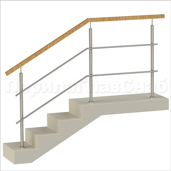 - Два ригеля на сварке, квадратный деревянный поручень и круглые стойки