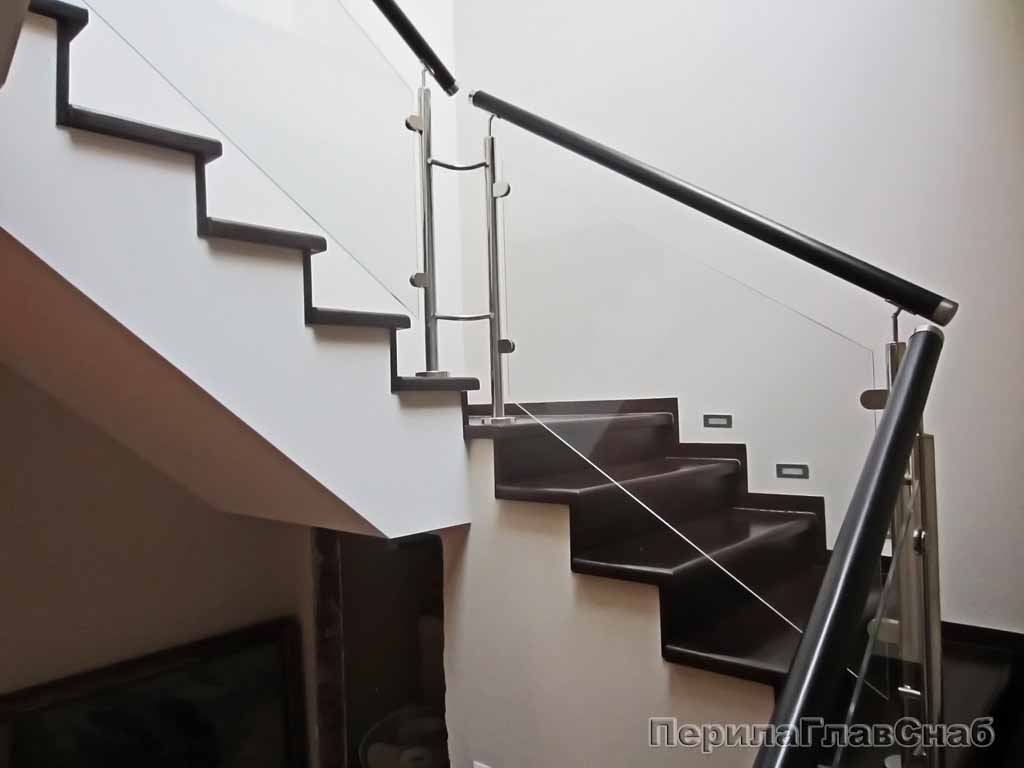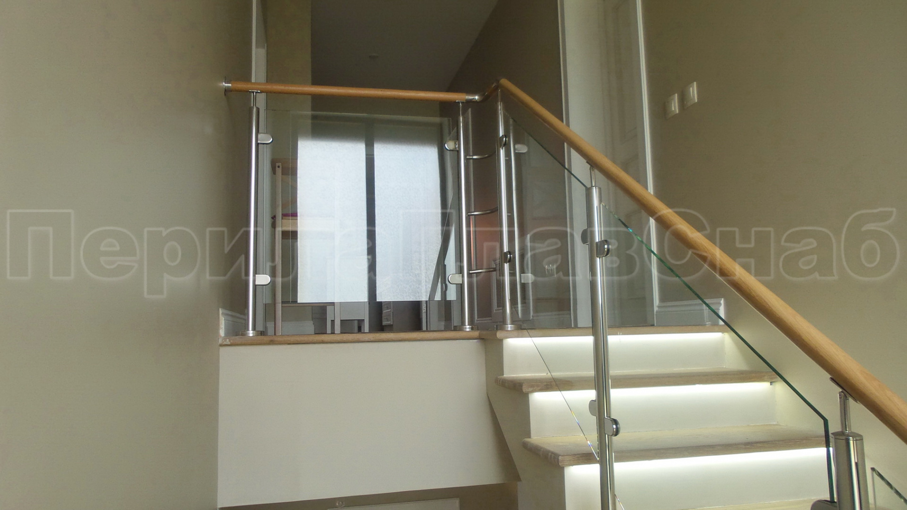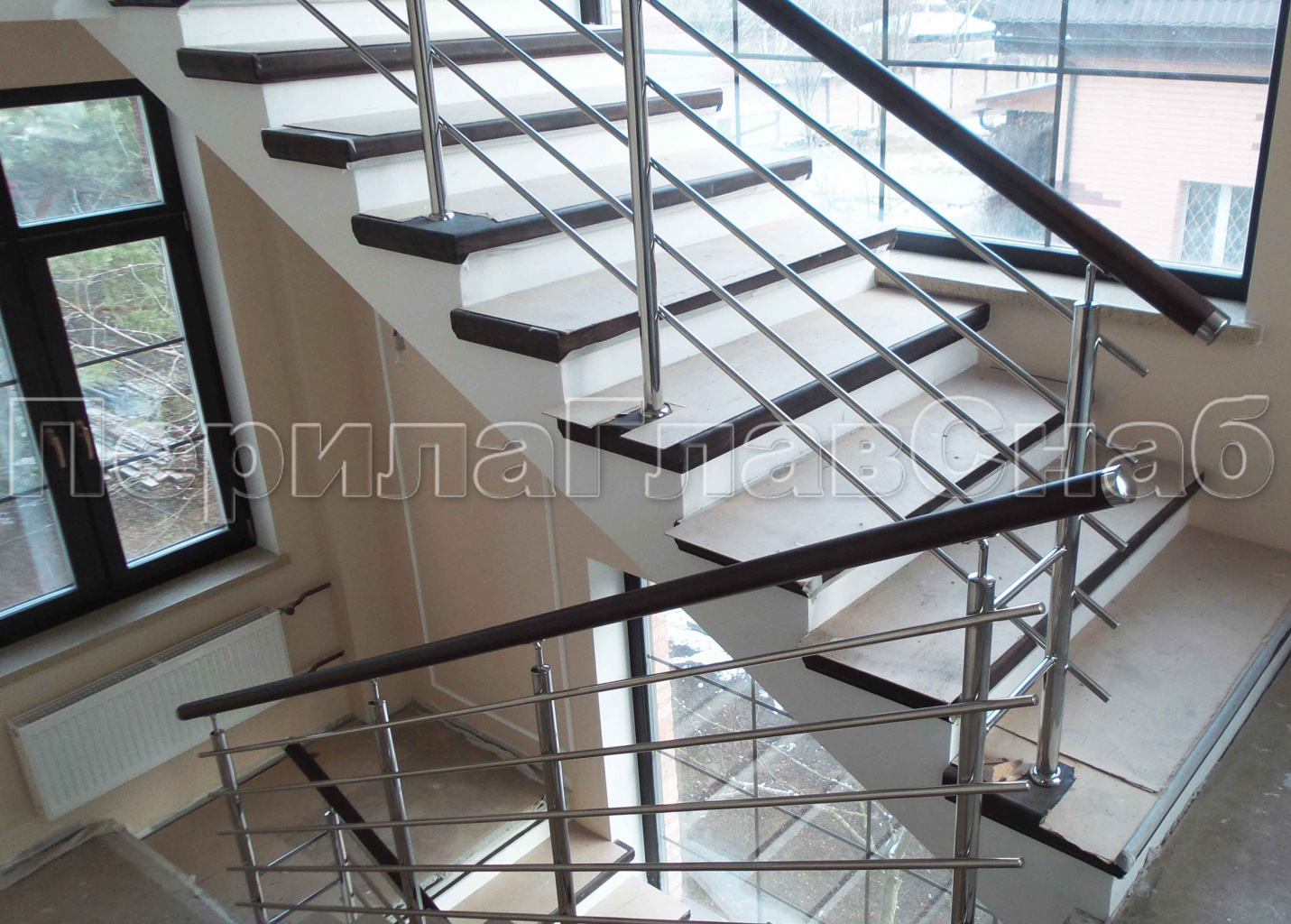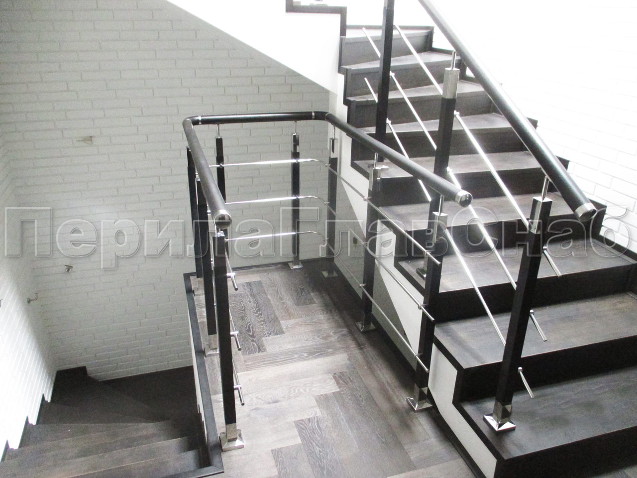 Четыре ригеля на держателях, квадратный поручень и стойки с деревянными вставками