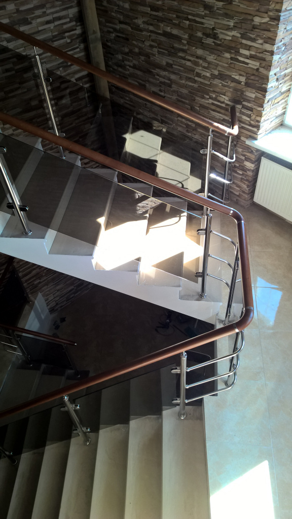 - Устанавливая ограждения с деревянными вставками лучше всего использовать заполнение из каленого стекла на стеклодержателях для повышения безопасности.