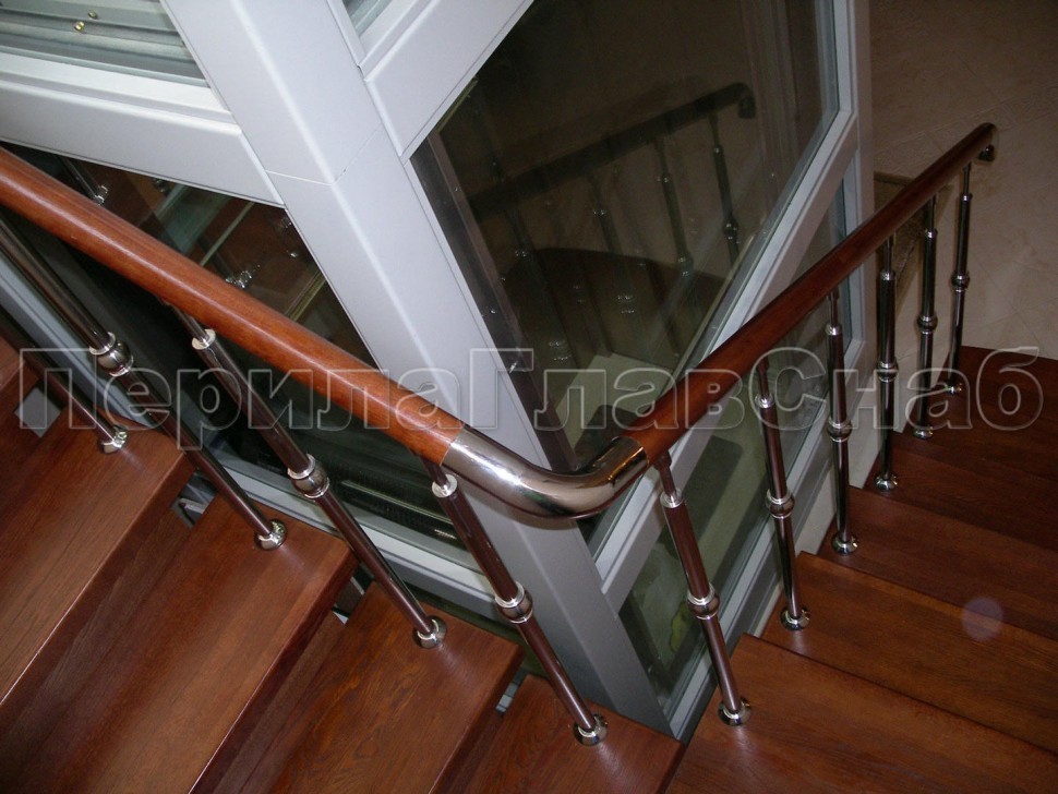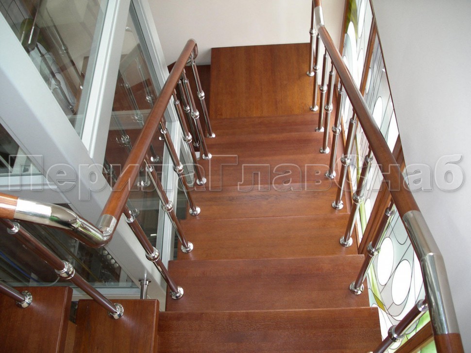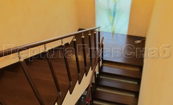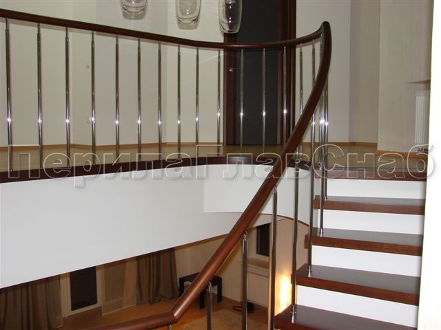 - Ограждения со стойками в каждую ступень с круглым деревянным поручнем без ригелей