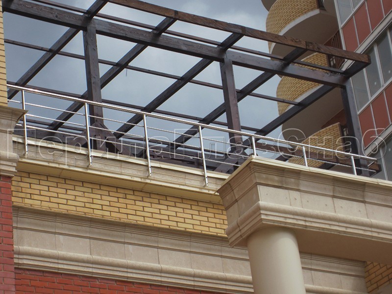 Стойки крепятся в балконное перекрытие, либо прямо, либо в торец перекрытия. Низ стоек может быть крышкой различной формы и дизайна.