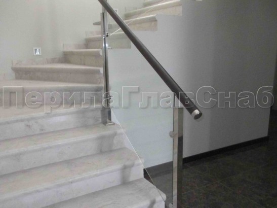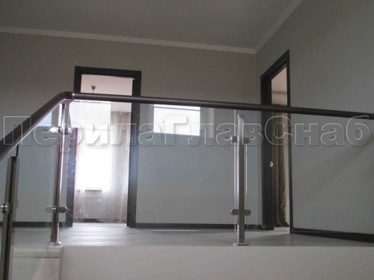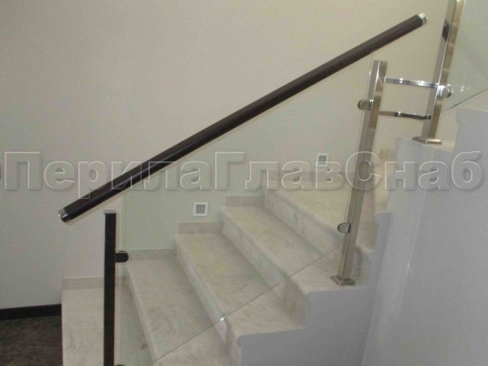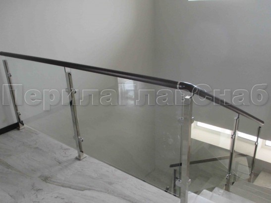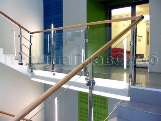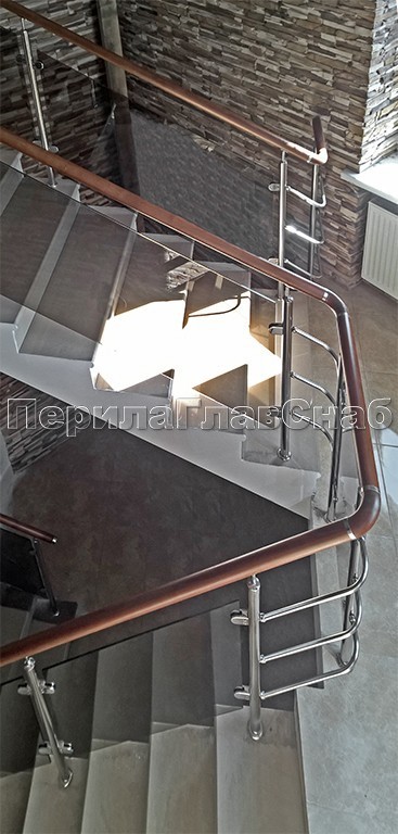 - Ограждение с деревянным поручнем, стеклом и стойками