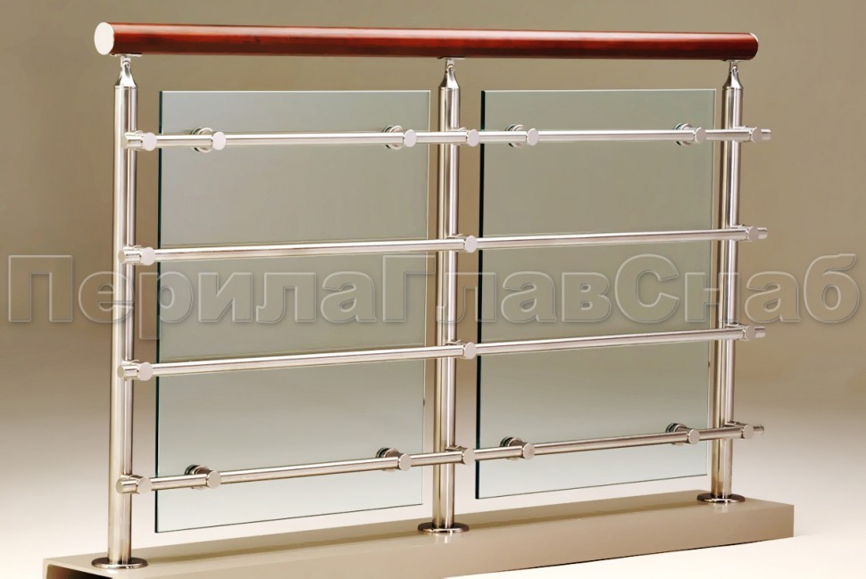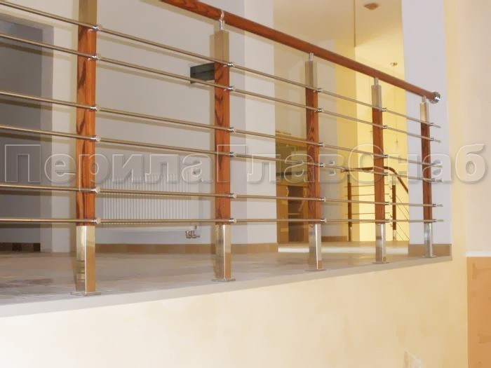 - Четыре ригеля на держателях, круглый деревянный поручень и квадратные стойки
