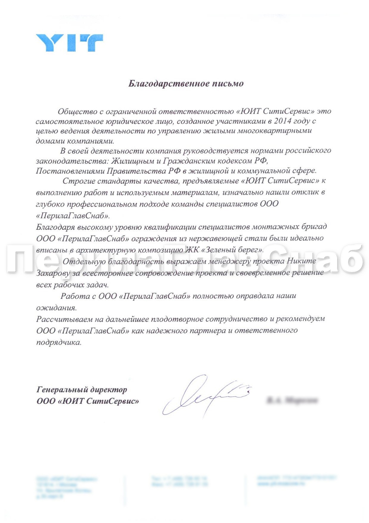 Общество с ограниченной ответственностью «ЮИТ СитиСервис» это самостоятельное юридическое лицо, созданное участниками в 2014 году с целью ведения деятельности по управлению жилыми многоквартирными домами компаниями. В своей деятельности компания руководствуется нормами российского законодательства: Жилищным и Гражданским кодексом РФ, Постановлениями Правительства РФ в жилищной коммунальной сфере. Строгие стандарты качества, предъявляемые «ЮИТ СитиСервис» к выполнению работ и используемым материалам, изначально нашли отклик в глубоко профессиональном подходе команды специалистов ООО «ПерилаГлавСнаб». Благодаря высокому уровню квалификации специалистов монтажных бригад ООО «ПерилаГлавСнаб» ограждения из нержавеющей стали были идеально вписаны в архитектурную композицию ЖК «Зеленый берег». Отдельную благодарность выражаем менеджеру проекта Никите Захарову за всестороннее сопровождение проекта и своевременное решение всех рабочих задач. Работа с ООО «ПерилаГлавСнаб» полностью оправдала наши ожидания. Рассчитываем на дальнейшее плодотворное сотрудничество и рекомендуем ООО «ПерилаГлавСнаб» как надежного партнера и ответственного подрядчика.