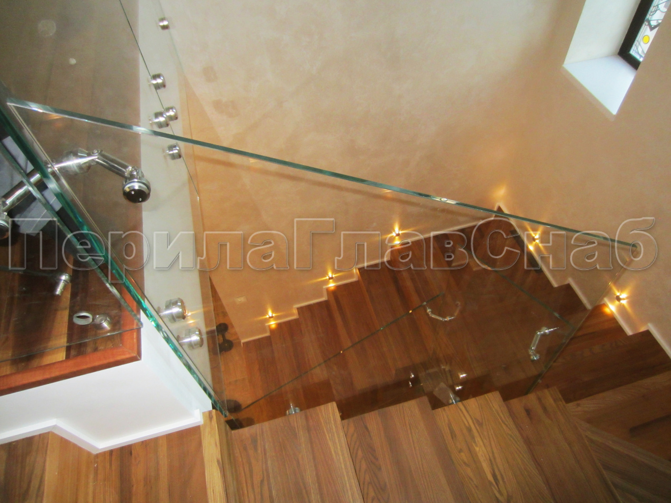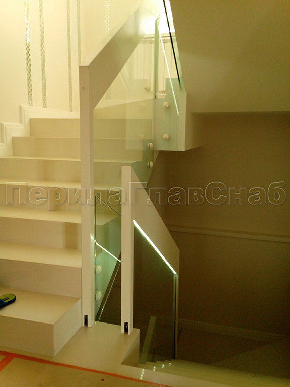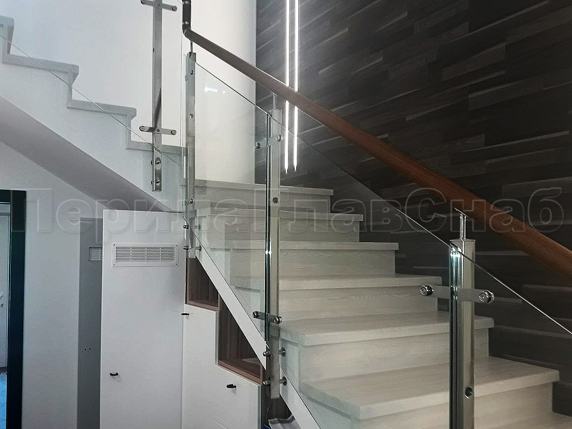 На маршевых лестницах ограждение без стоек обычно крепятся сбоку на точечных держателях. Это экономит много места на марше, особенно когда используешь трубу с пазом, которая одевается на стекло сверху. Вообще поручень с пазом как будто специально придуман для использования со светодиодной подсветкой. Стекло, подсвеченное в торец днем, искрится в солнечном свете, а ночью излучает приглушенный свет светодиодной подсветки. Если в здании много солнечного света, то лучше всего использовать толстое осветленное стекло - оно более прозрачное, чем обычное стекло.