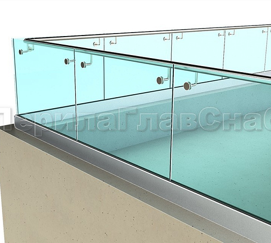 Конструкция такого ограждения не содержит стоек. Несущими характеристиками обладает стекло и алюминиевый профиль, в который стекло крепится. Используется алюминиевый анодированный «зеркальный» профиль.