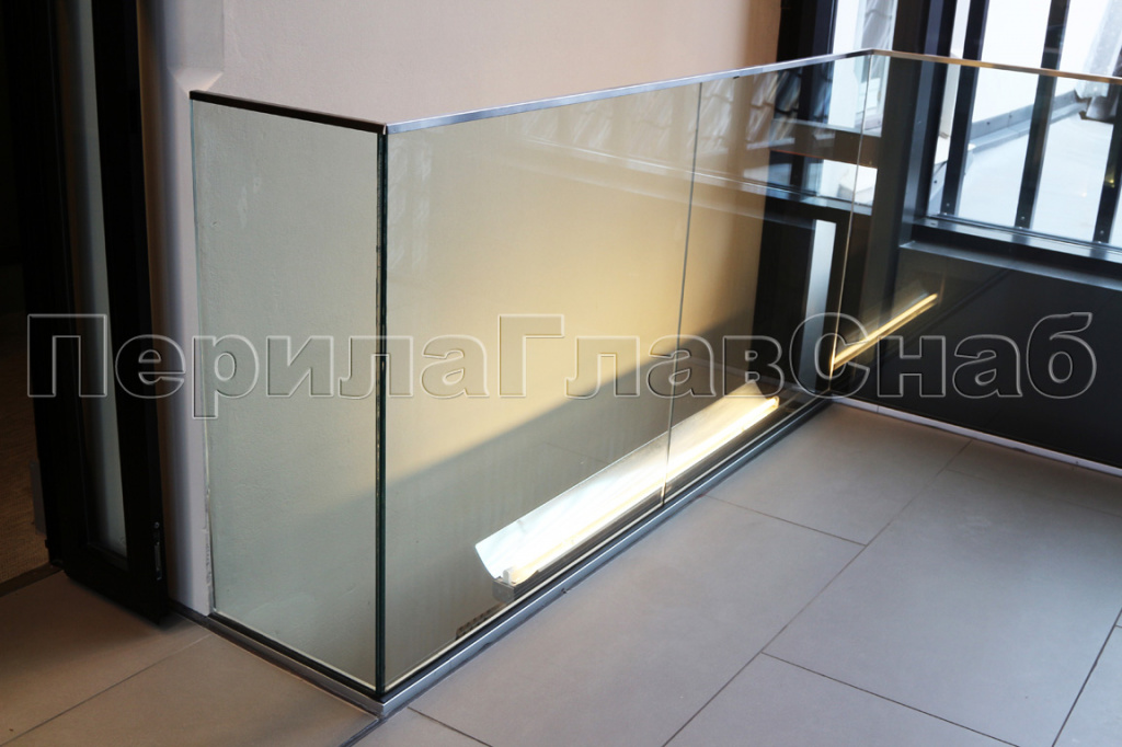 несущее стекло с креплением в торец с повышенной высотой стекла и с облегченным нержавеющим поручнем на выносных держателях.