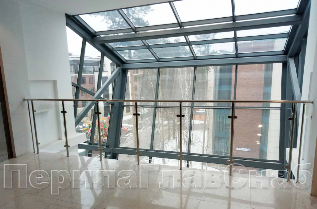 Несущее стекло для атриума установлено на алюминиевый анодированный профиль. Преимущества такого профиля в том, что он обладает зеркальным блеском, крепится на анкера и обладает огромной надежностью (выдерживает очень большие нагрузки и на разгиб). Для комфорта посетителей был использован поручень из трубы с пазом. Труба с пазом - идеальный поручень для несущего стекла,удобна в эксплуатации, а так же защищает кромку стекла.