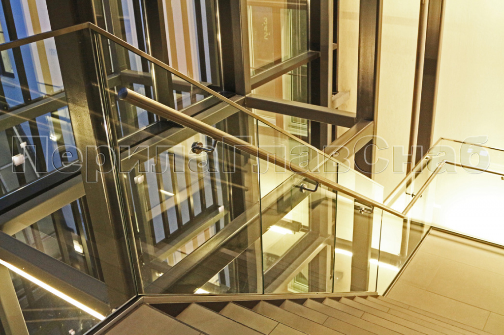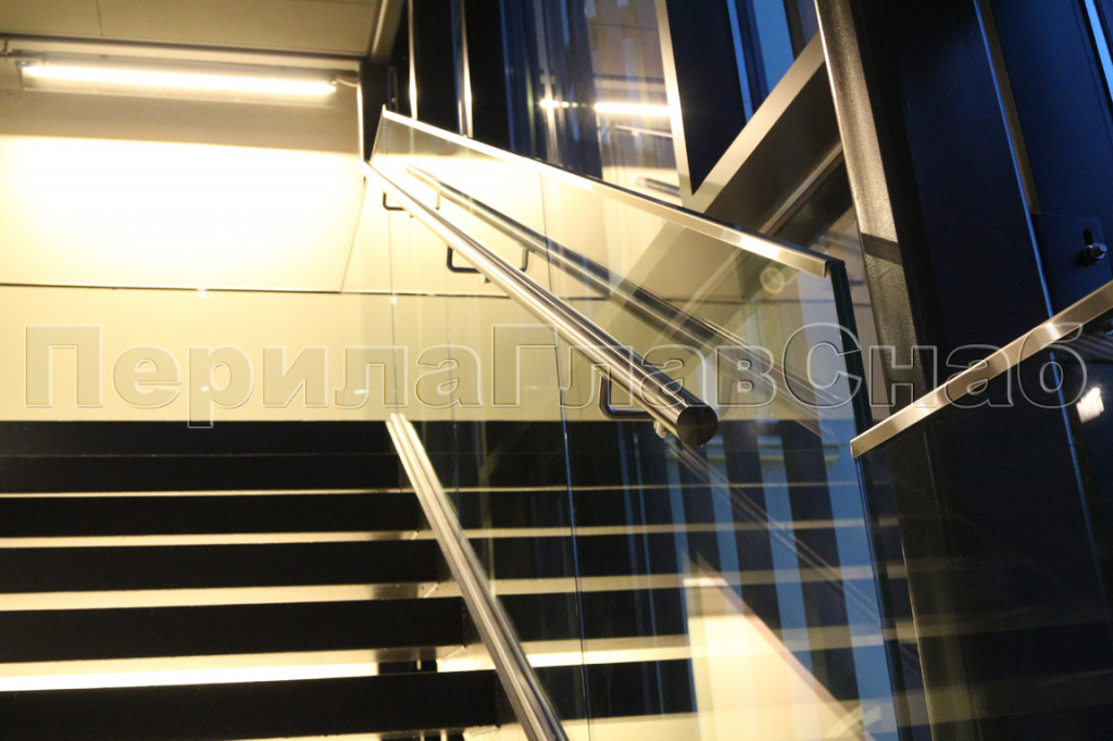 Цельностеклянные перила с точечным креплением в торец ступени (так как заказчик хотел видеть непрерывность и, как бы цельность стекла). В качестве стекла был выбран триплекс тонированный в массе (цвет подбирался по RAL). Для комфортной эксплуатации был установлен нержавеющий полированный поручень на выносных держателях (AISI304L)