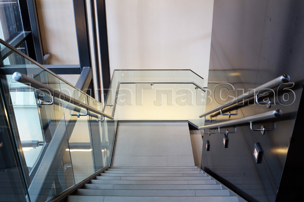 Цельностеклянные ограждения для лестниц в бизнес- и торговых центрах.