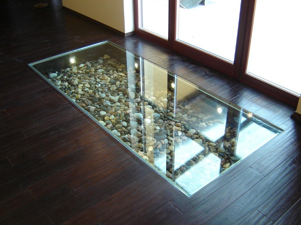 2. Под стеклянным полом можно собрать любую декоративную композицию, например имитацию морского побережья. Таким образом стеклянный пол визуально расширяет оформительские возможности дизайна интерьера.
