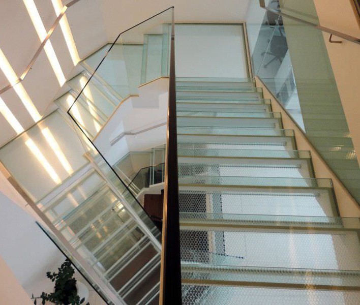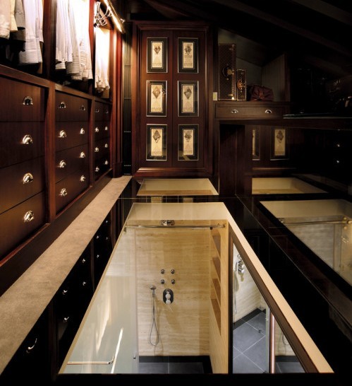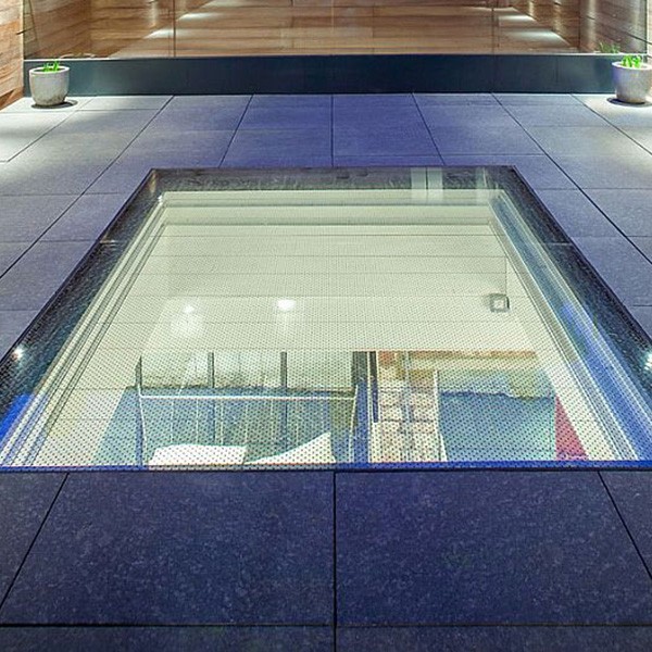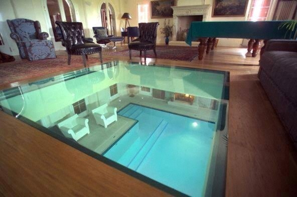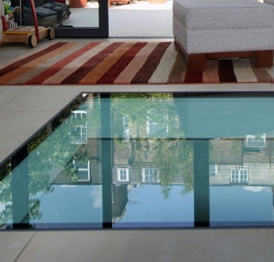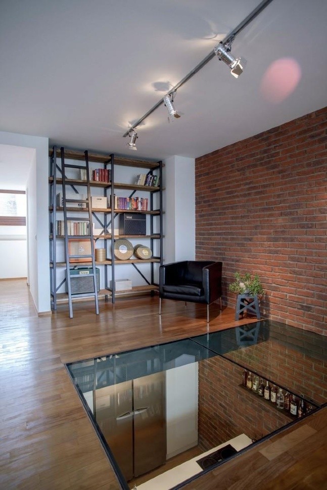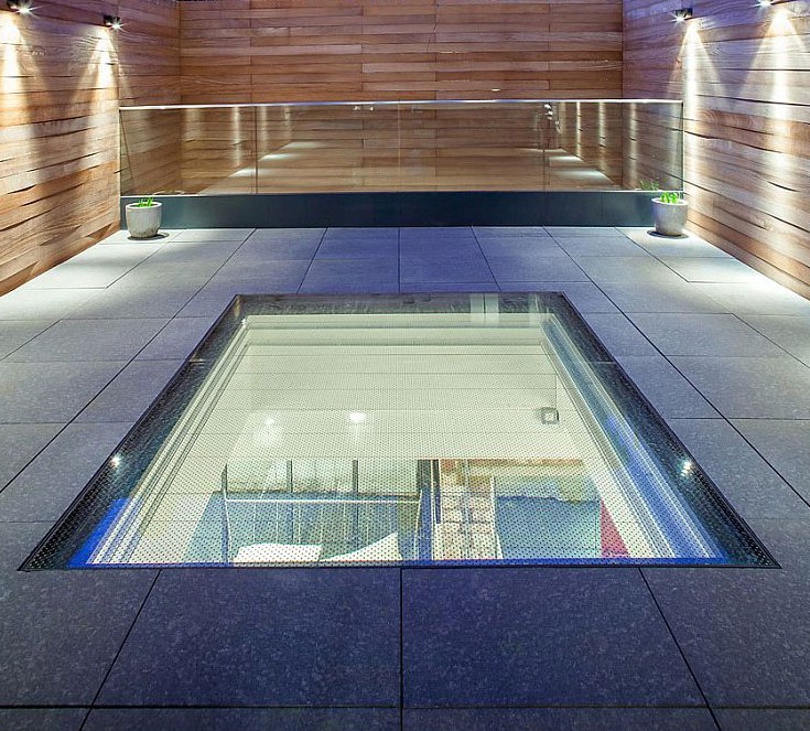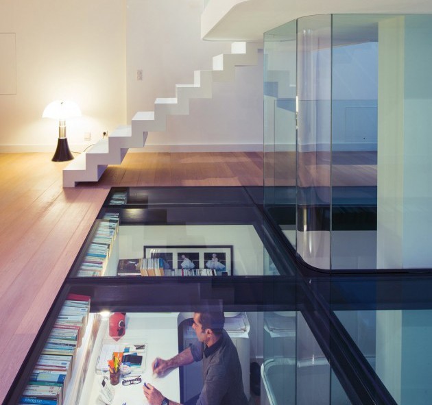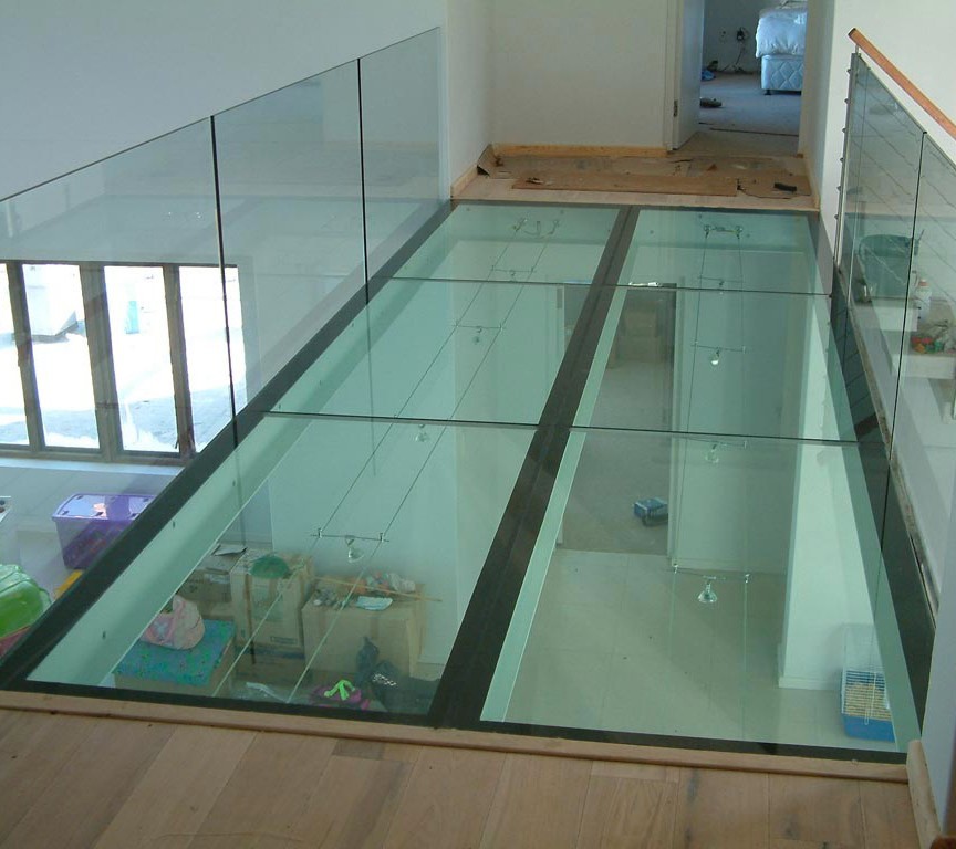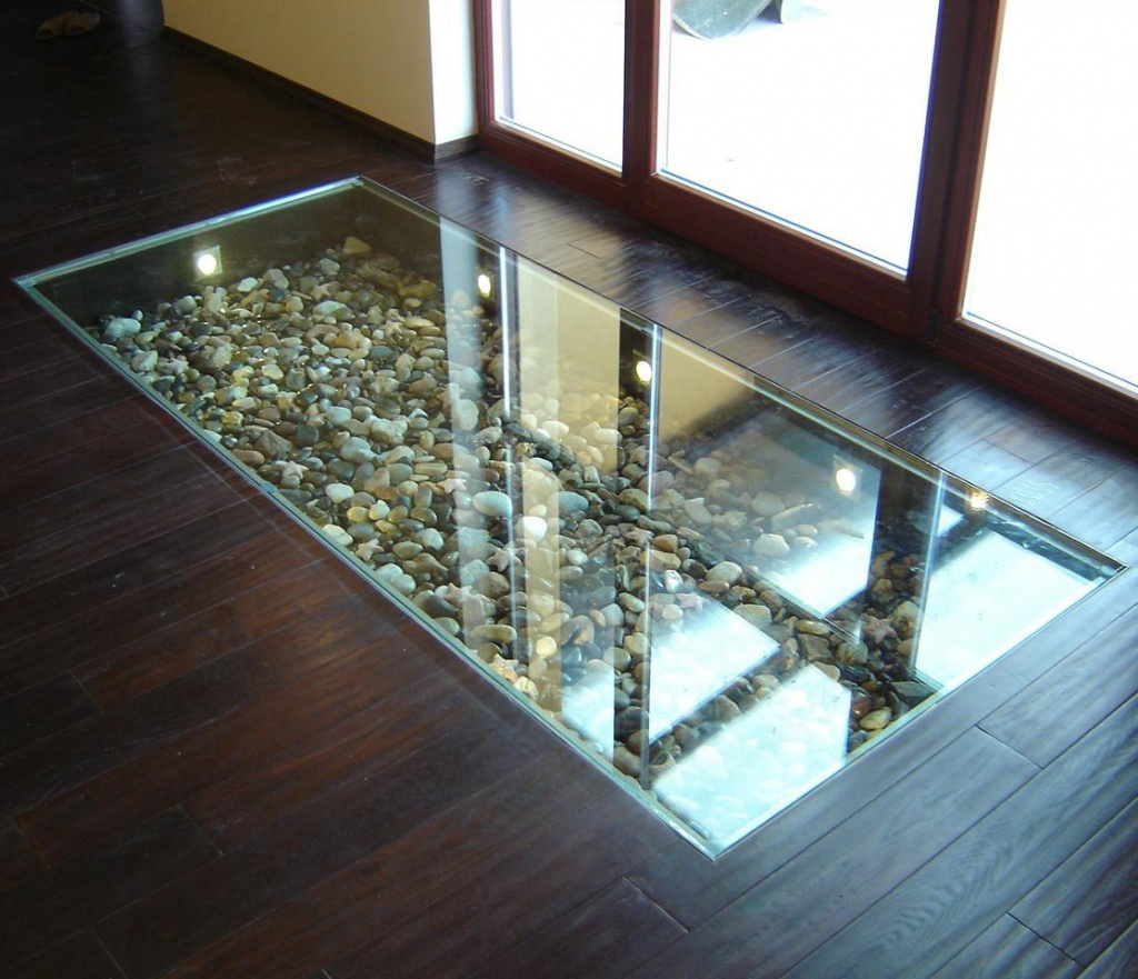 В этом случае стеклянный пол является не только декоративным элементом, он также значительно облегчает конструкцию самого перекрытия.